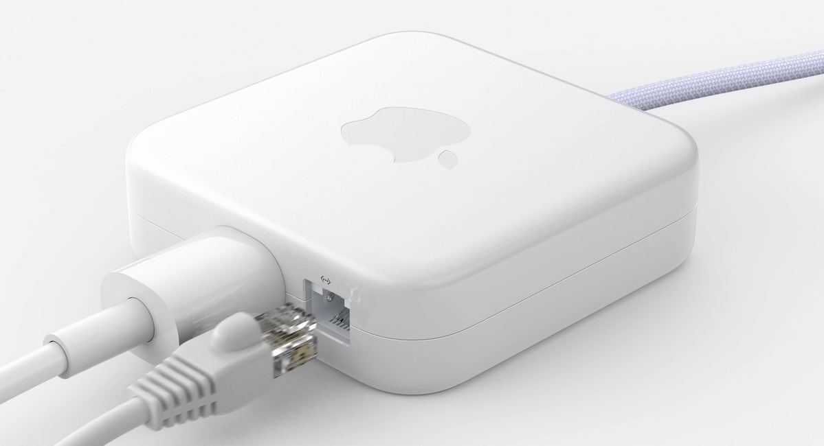iMac开发了新一代143W电源适配器,输出线缆为多功能不可拆卸的同色编织磁吸线,长度2米。输入端为可拆卸设计,并加入了一个RJ45有线网络接口,便于用户通过磁吸线就可以实现供电与有线网络连接,无需额外使用USB-C网络转接卡。