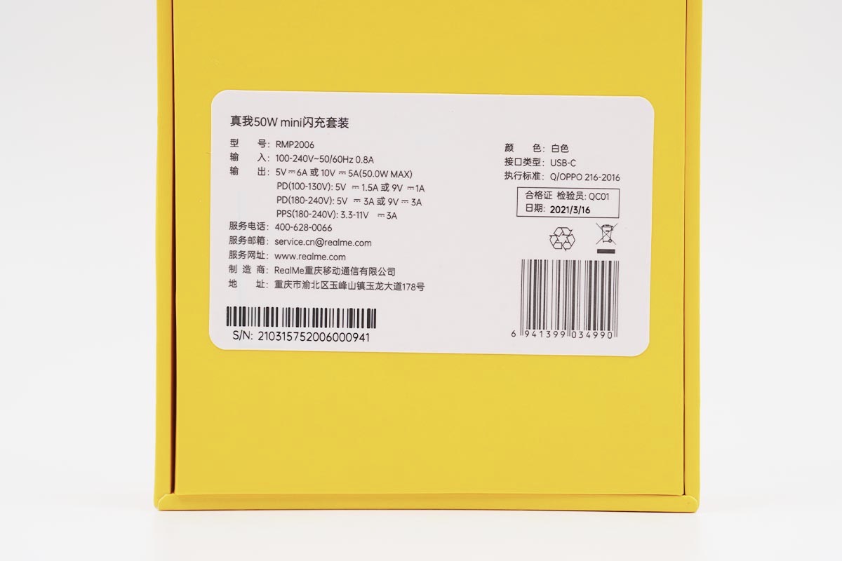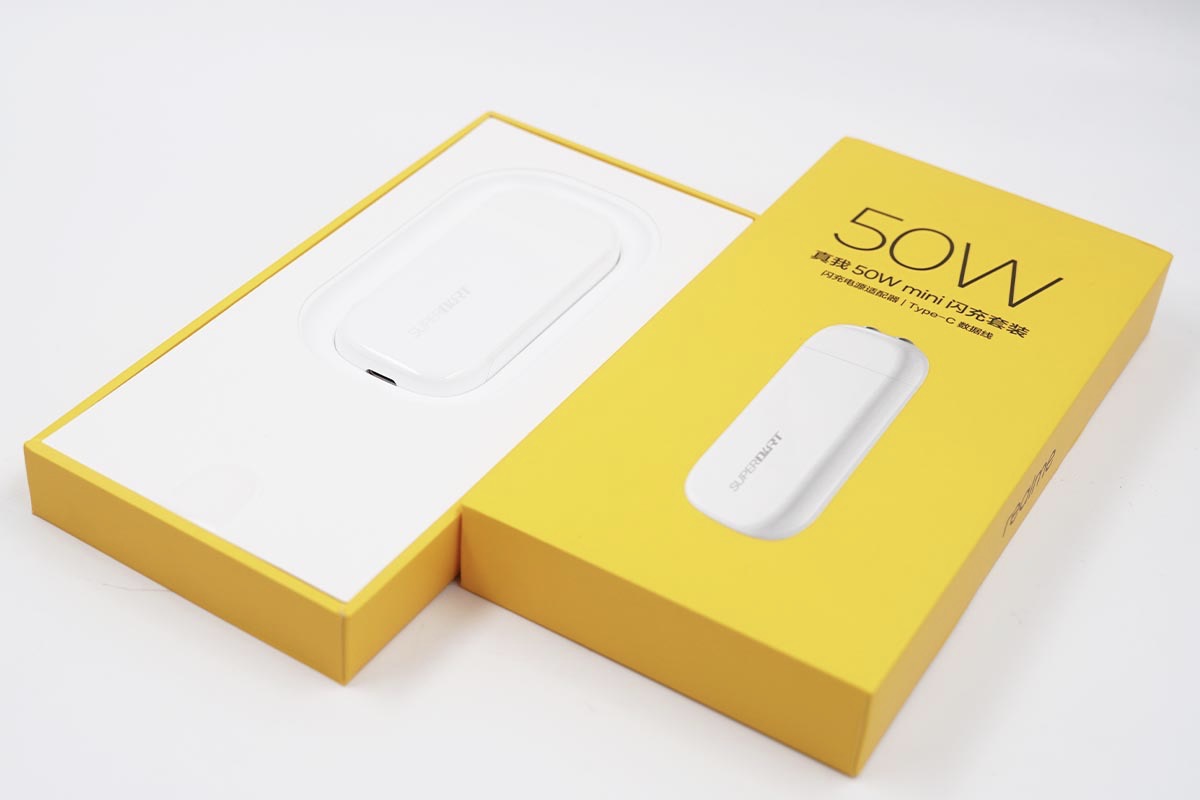 realme的产品包装盒一直都是以黄色作为主体颜色,正面大大的“50W”说明了这款充电器的性能,具体的名称为真我50W mini闪充套装。包装盒内包含闪充电源适配器和USB-C数据线。