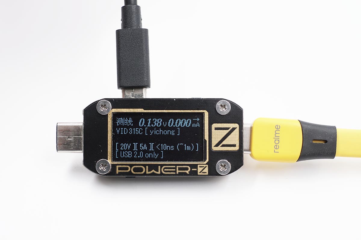 使用POWER-Z KM001C读取线材的信息,实测线材支持20V5A 100W的充电功率,USB标准为USB2.0。