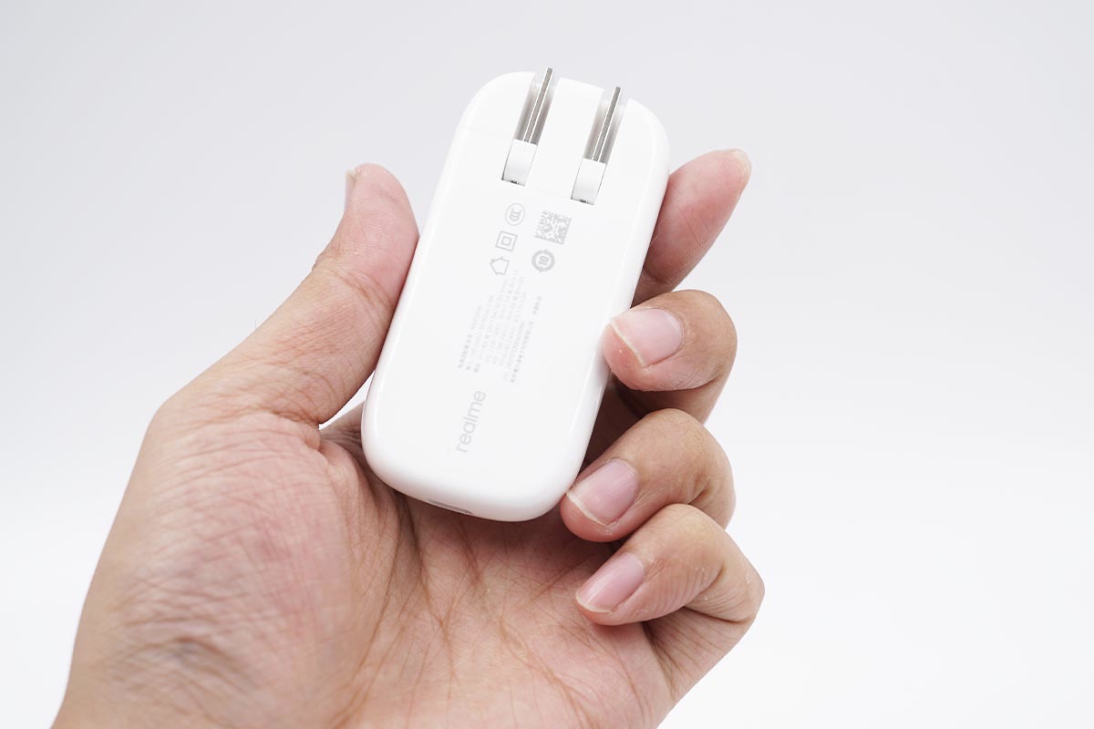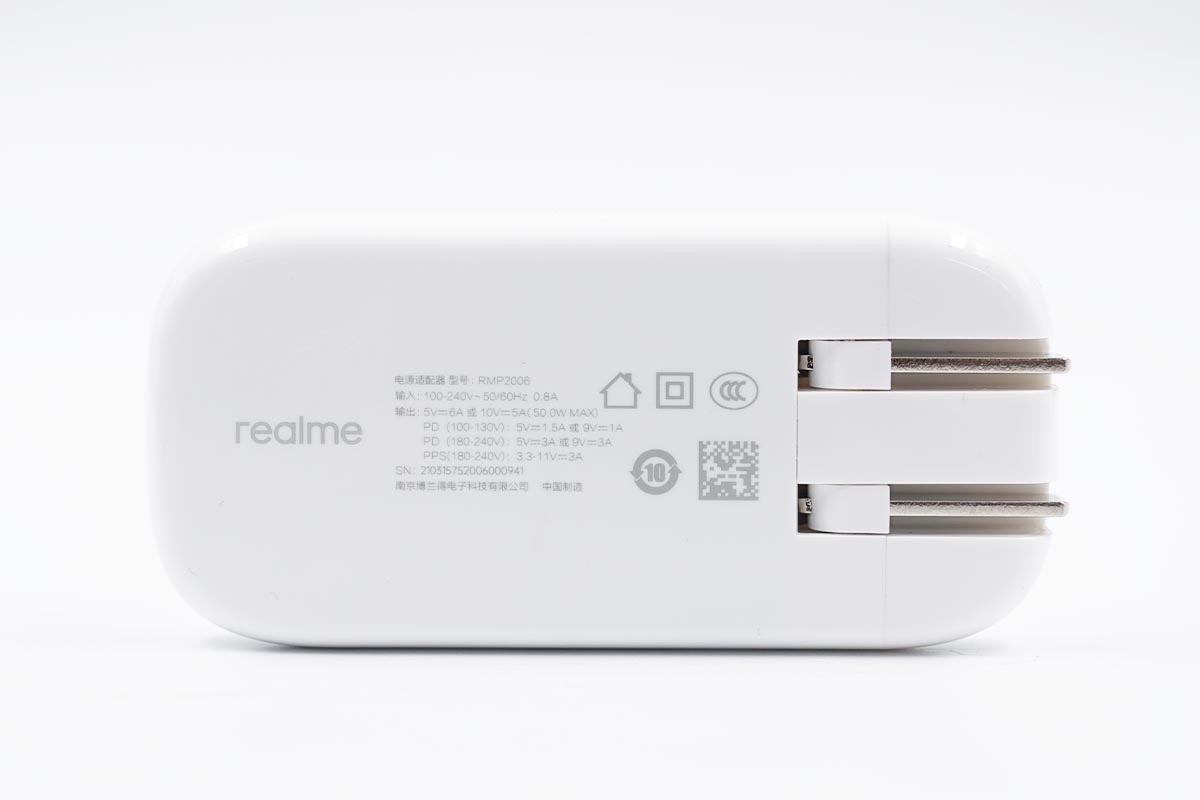 充电器的背面除了realme的品牌Logo外还印制着产品的参数,具体的参数详情已经在包装盒的位置介绍过了,这里略过。