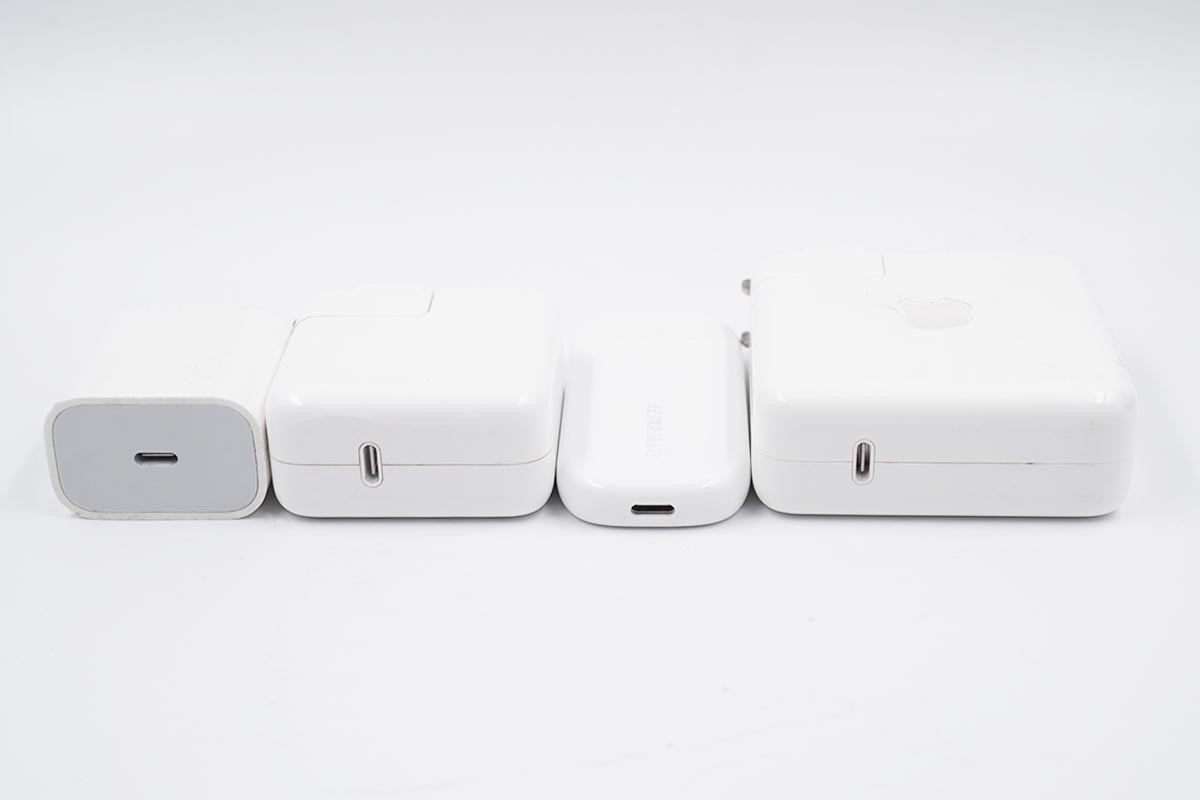 从左到右依次为苹果20W PD充电器、苹果30W PD充电器、realme真我50W mini闪充充电器以及苹果61W PD充电器。