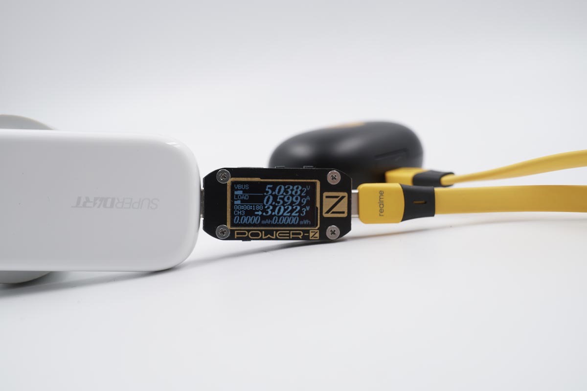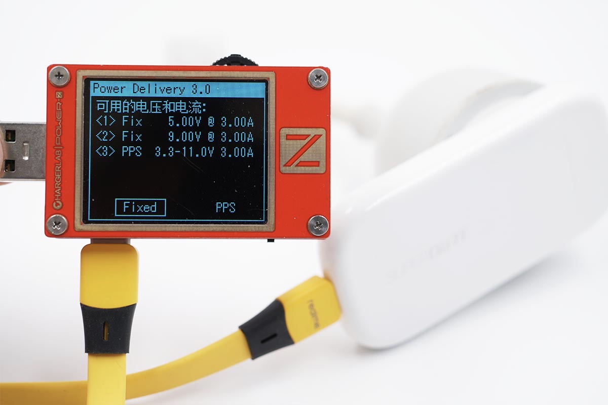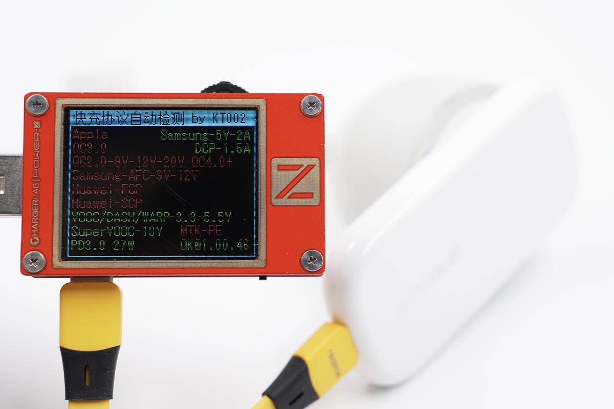 使用POWER-Z KT002读取充电器的快充协议,实测支持VOOC、DASH、WARP、SuperVOOC、PD等快充协议。具体充电器支持的快充协议还会在后面的兼容性测试模块进一步验证。