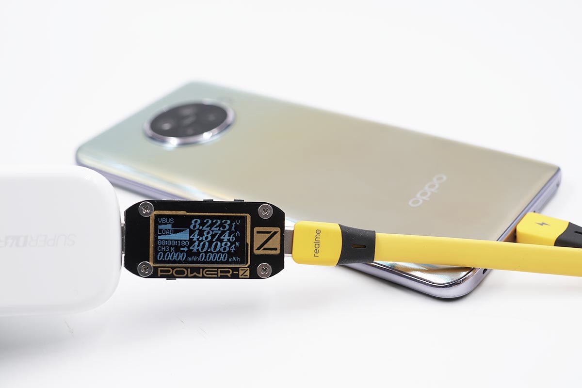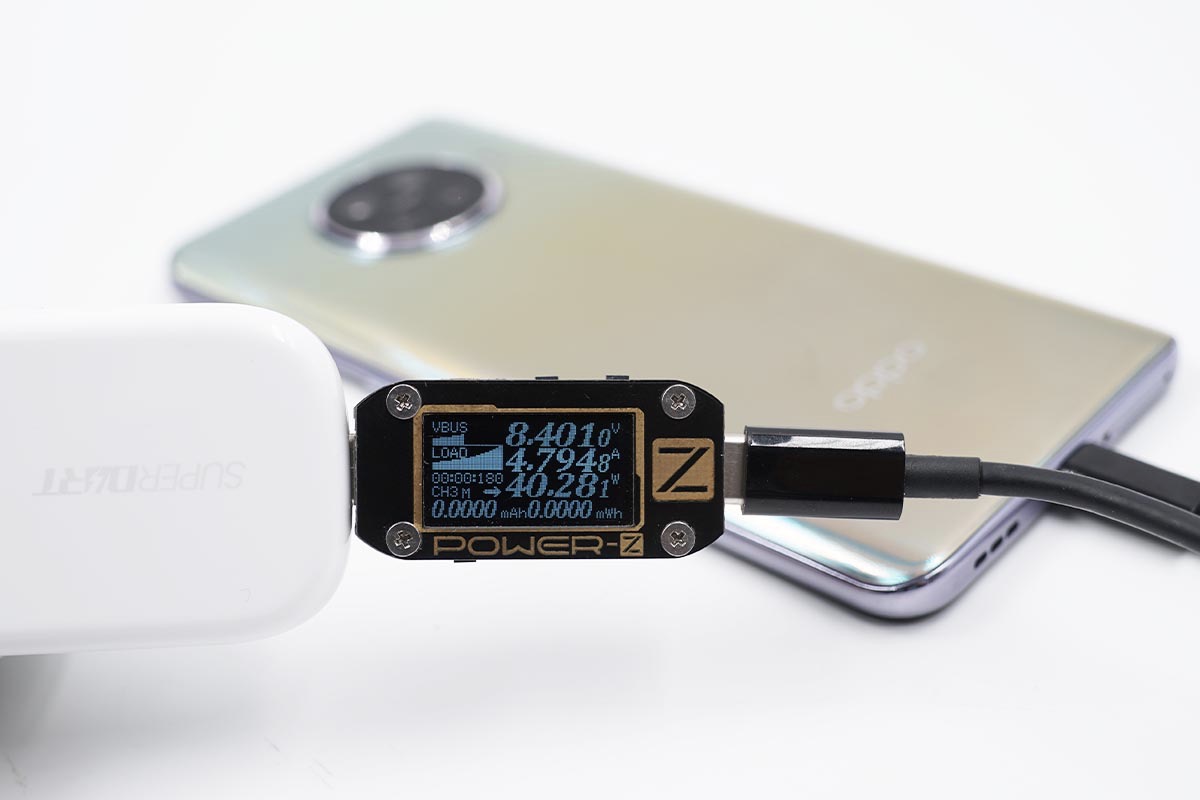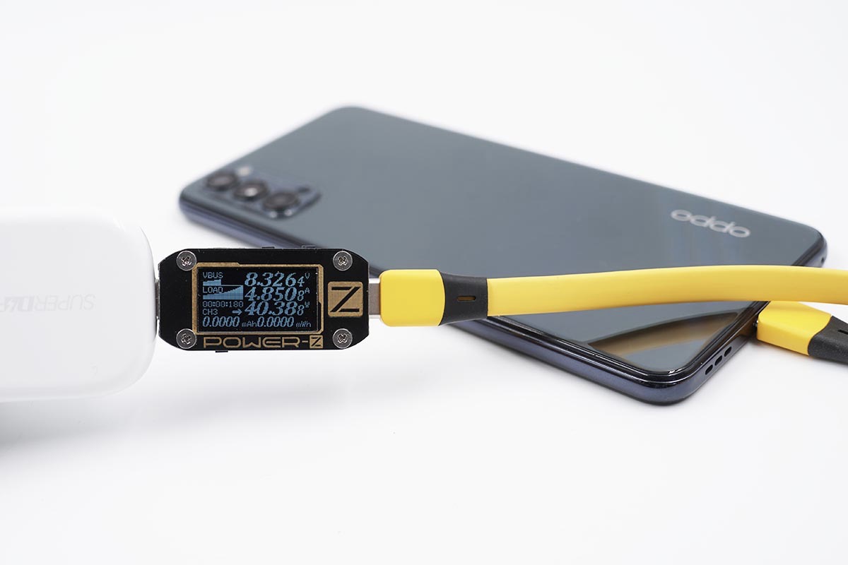使用充电器为OPPO Reno4充电,功率为8.32V 4.85A 40.38W,成功触发SuperVOOC闪充。