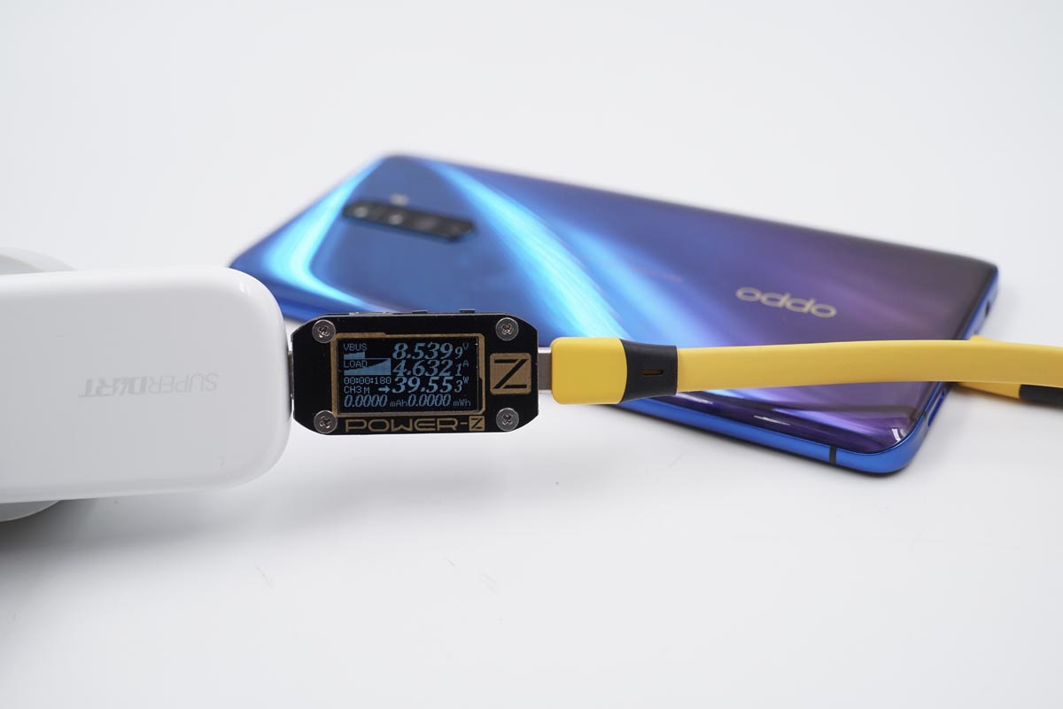 使用充电器为OPPO Reno Ace充电,功率为8.53V 4.63A 39.55W,成功触发SuperVOOC闪充。