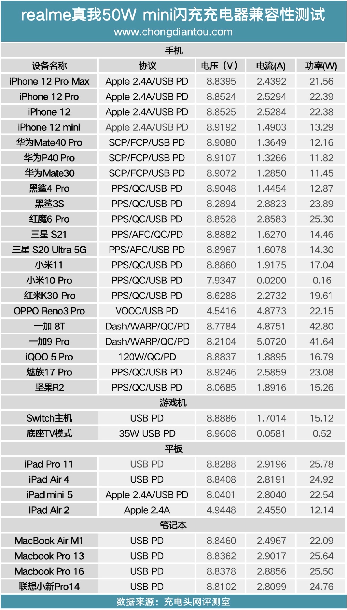 将所有的测试数据汇总成表,为苹果设备可以提供9V PD快充,为OPPO、realme、一加的数款机型充电都可以触发低压大电流快充。此外充电器支持9V3A PD快充档位,所以在为iPad或笔电充电时功率也可以达到25W左右,表现不错。