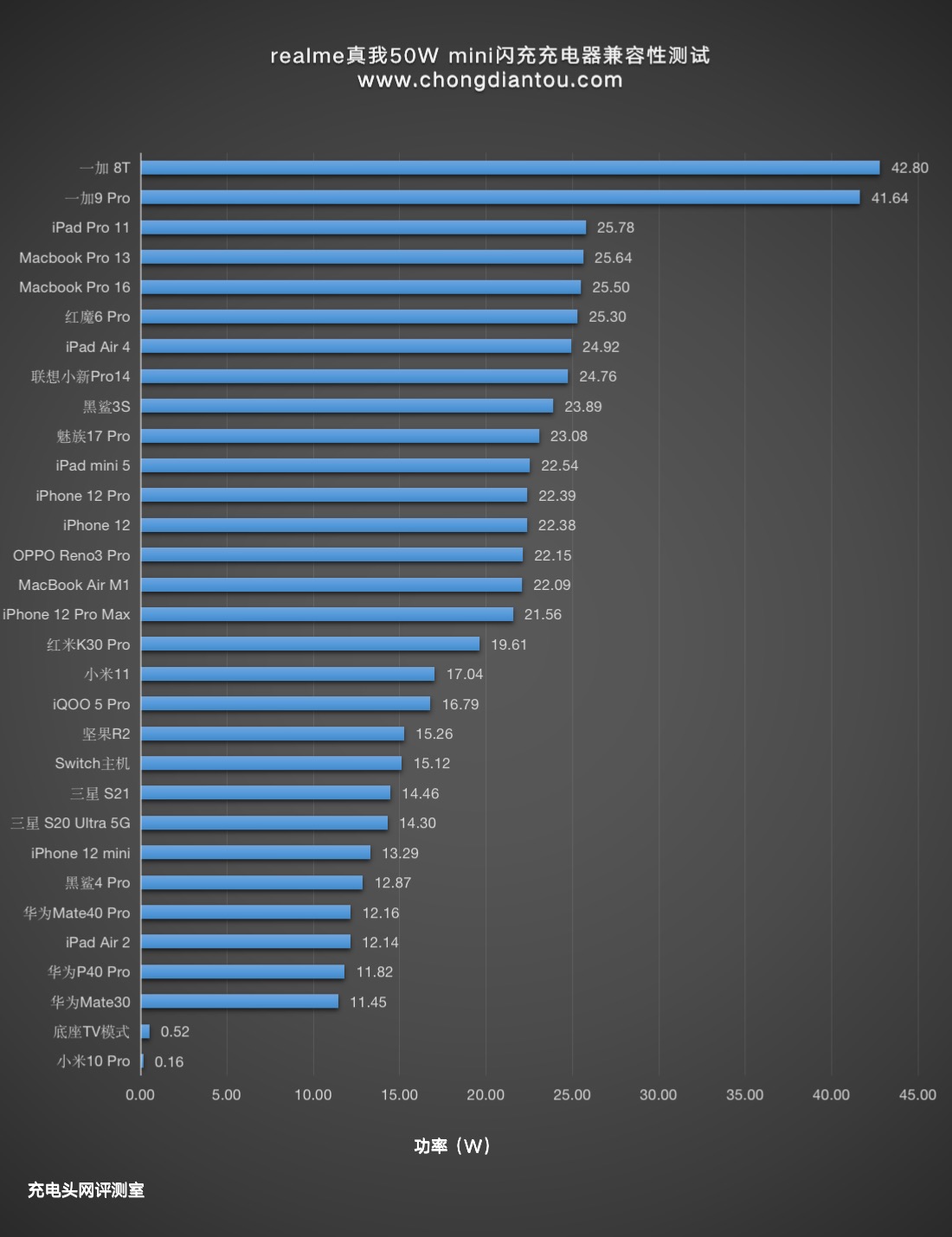 从柱状图上看,一加两款机型的功率最高,均处于40W+,支持PD快充的苹果设备功率在13W-26W左右,其他安卓设备功率在11W-26W之间。除此之外小编还针对OPPO、realme、一加的多款机型进行了测试,多数都在40W左右,感兴趣的可以向上翻看。