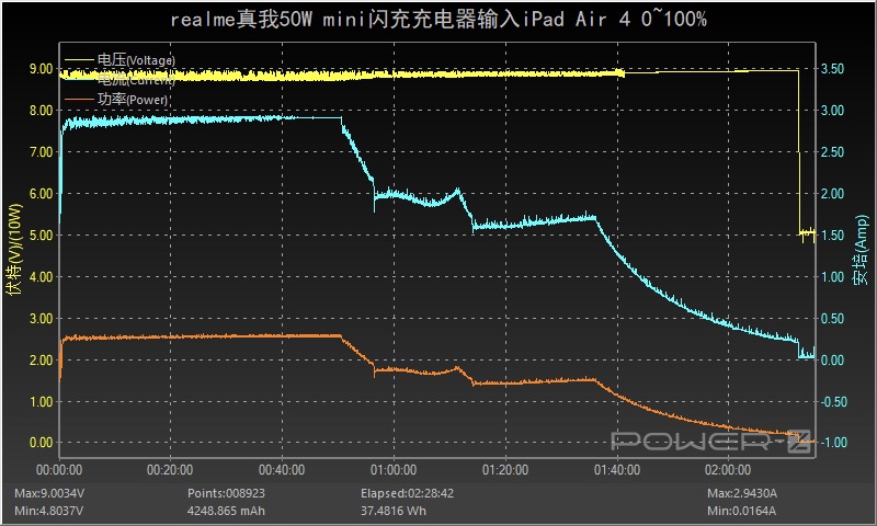 使用realme真我50W mini闪充充电器为iPad Air 4充电,连接充电器后迅速触发快充。约50分前功率在26W左右;56分到1小时11分功率在17W左右;1小时14分到1小时36分功率在15W左右。