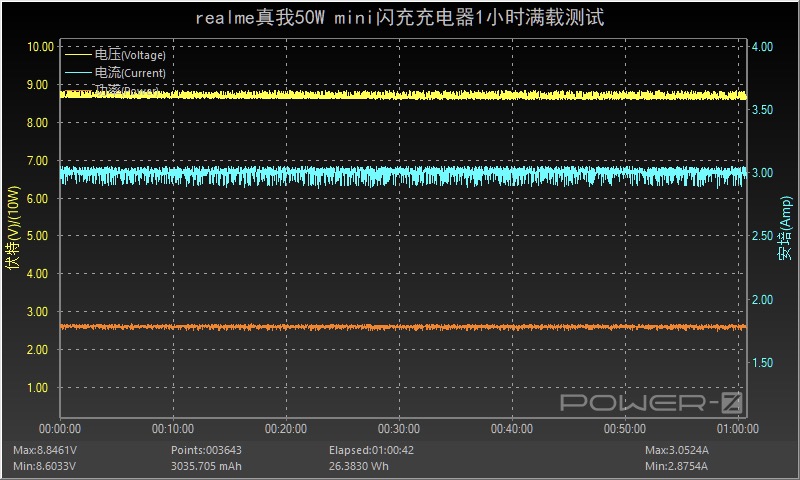 按照额定PD快充功率9V3A 27W满载对充电器进行稳定性测试,测试时间为一小时,测试过程中电压值存在小幅波动情况,不过整体还是比较稳定的。
