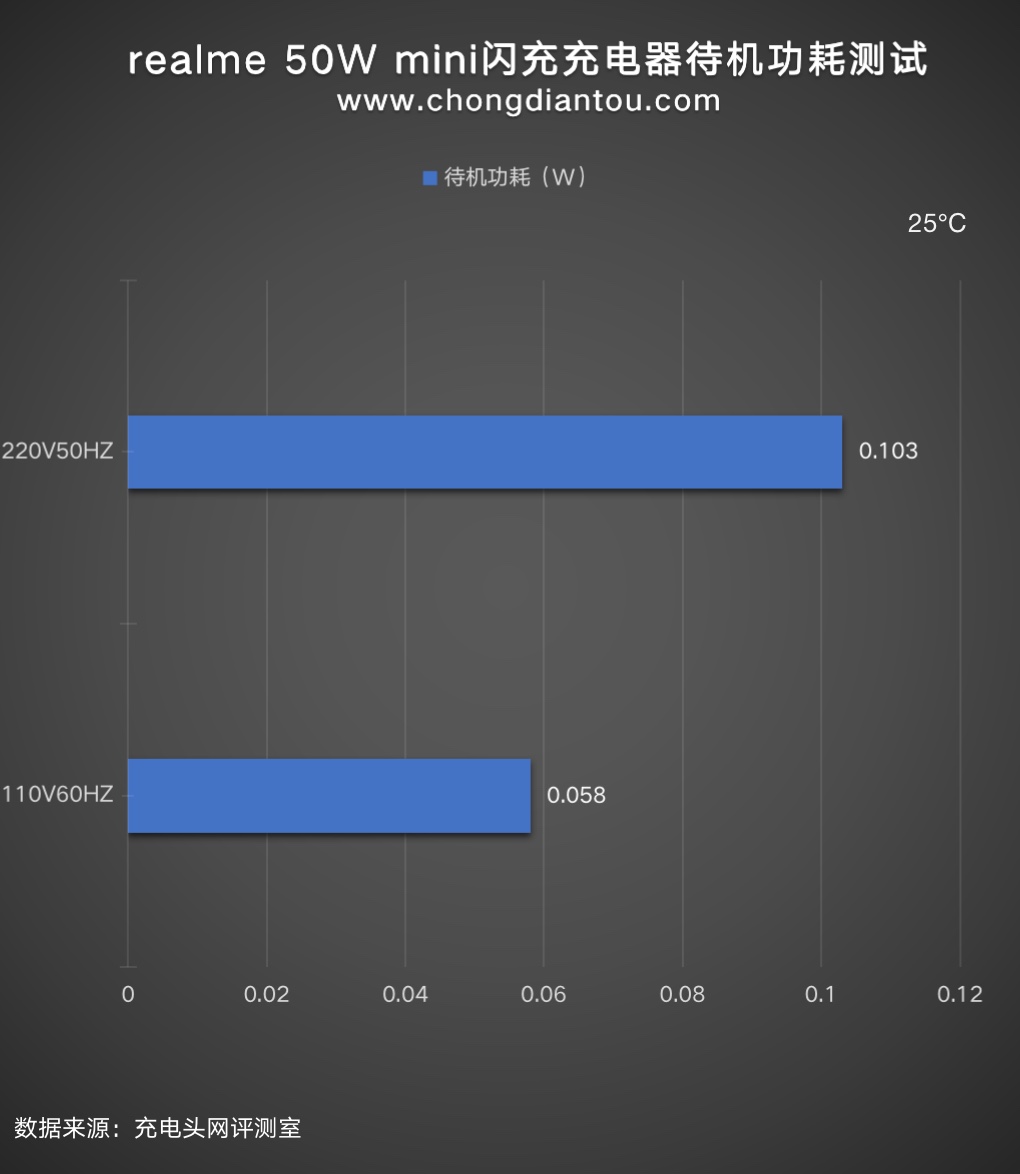 经过功率计测试,realme真我 50W mini闪充充电器在220V 50Hz的空载功耗为0.103W,换算下来一年损耗的电能约为0.9KW·h,若市价电为0.6元/KW·h,则充电器一年的空载功耗约为0.54元左右。