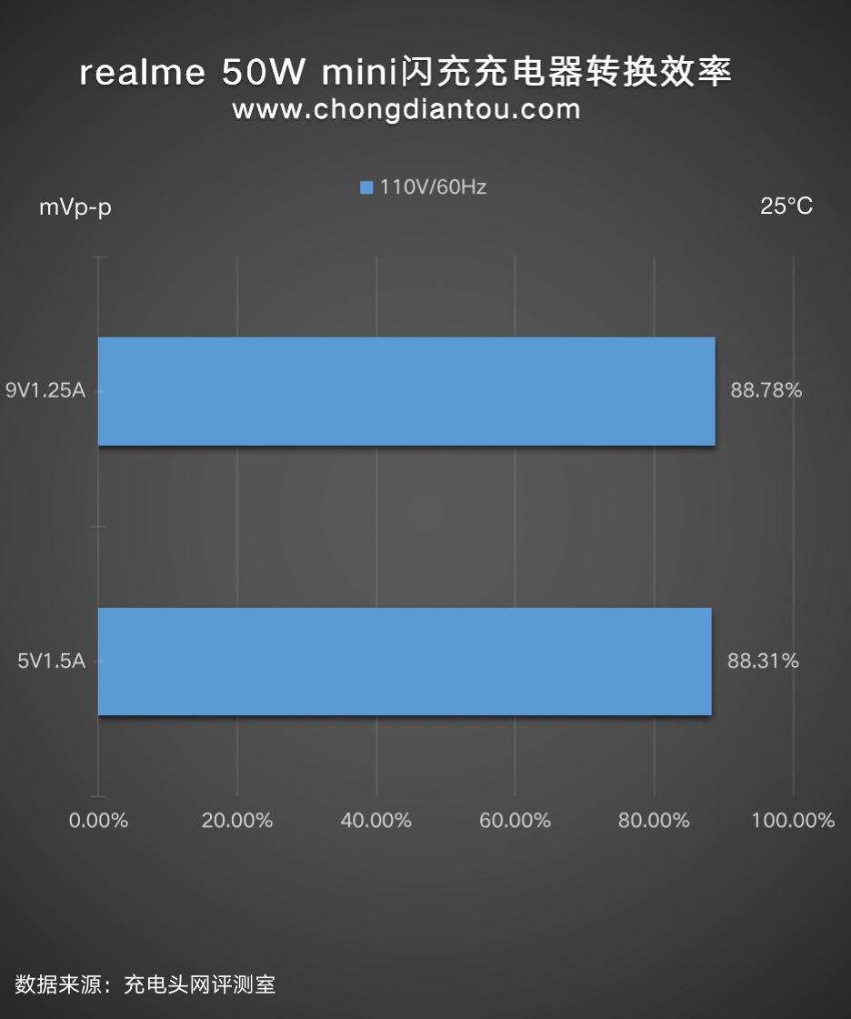 110V 60Hz下,充电器的转换效率从88.31%到88.78%不等。
