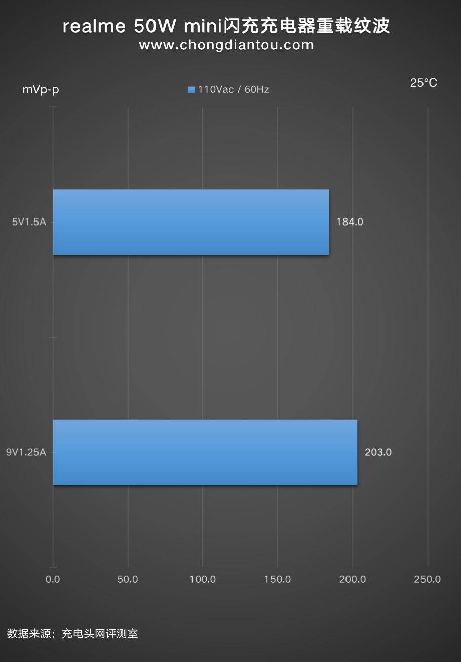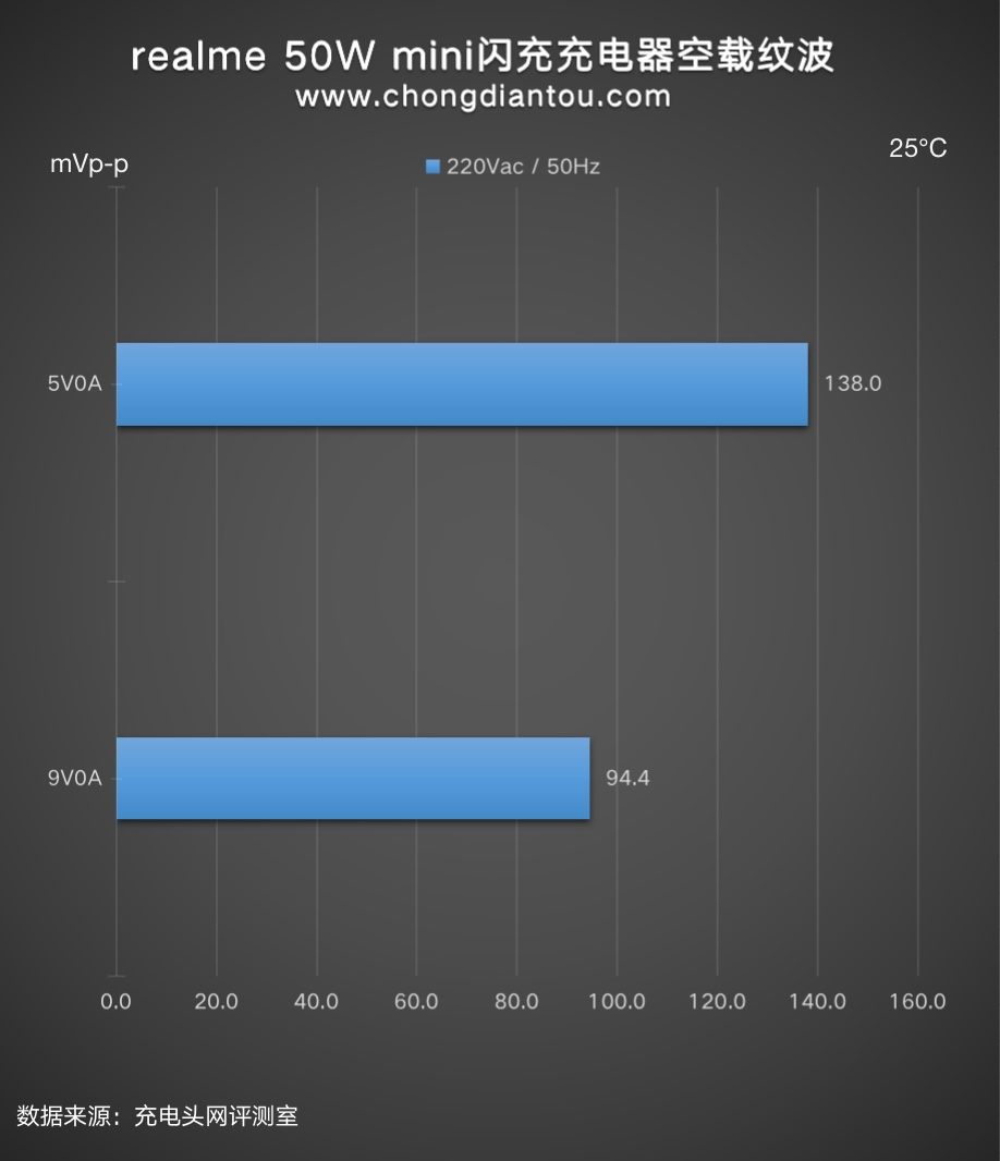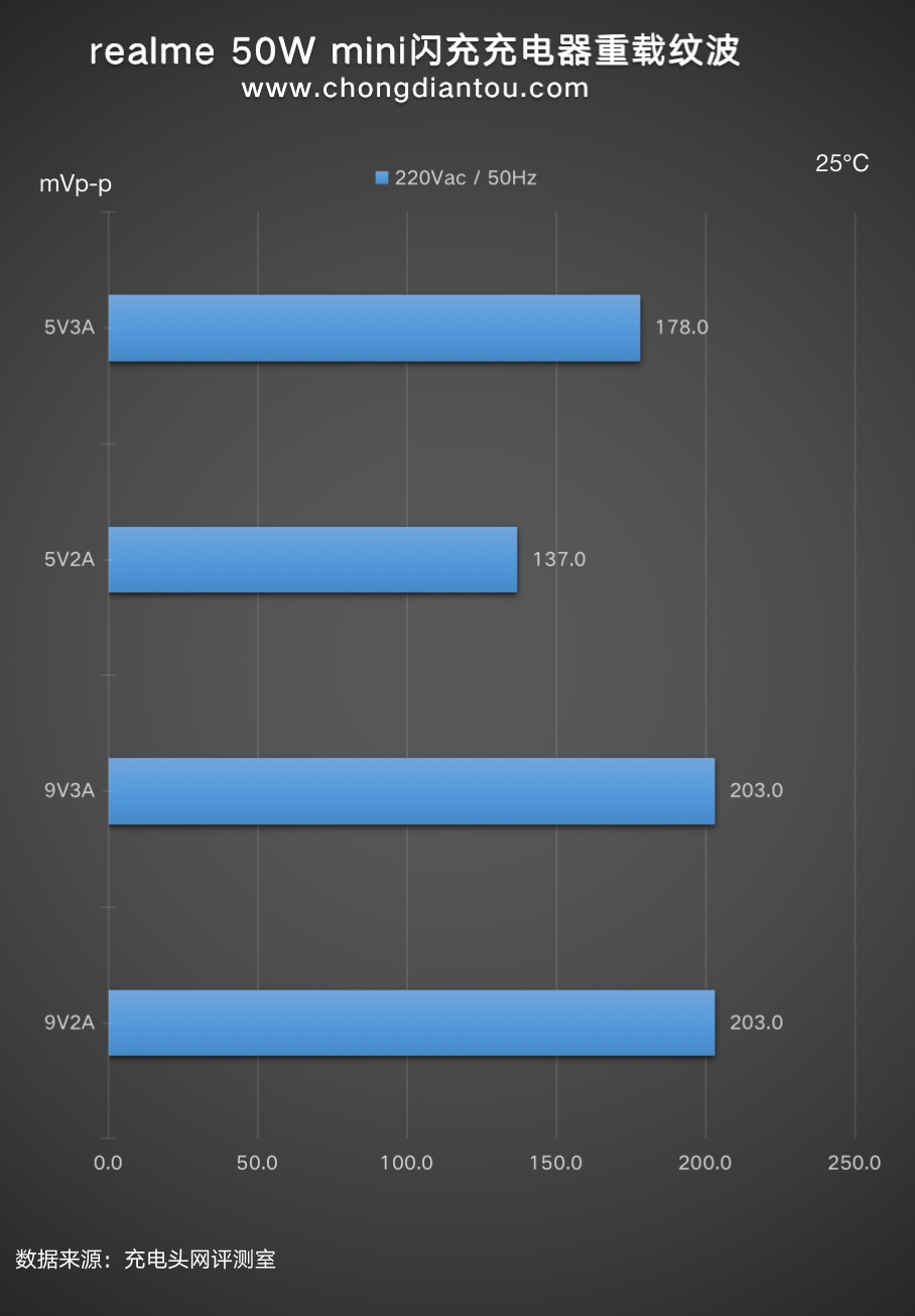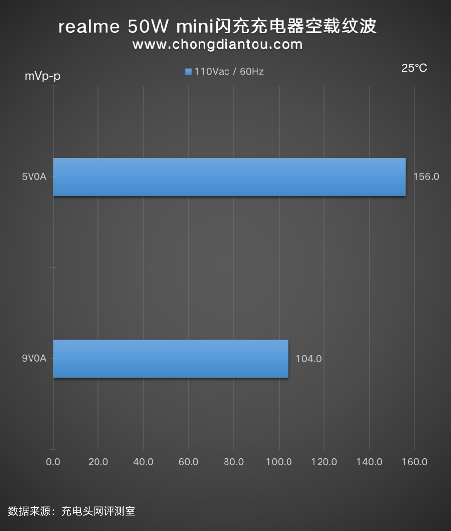 对realme真我50W mini闪充充电器在220V 50Hz和110V 60hz下的纹波分别进行了测试,实测结果如下。