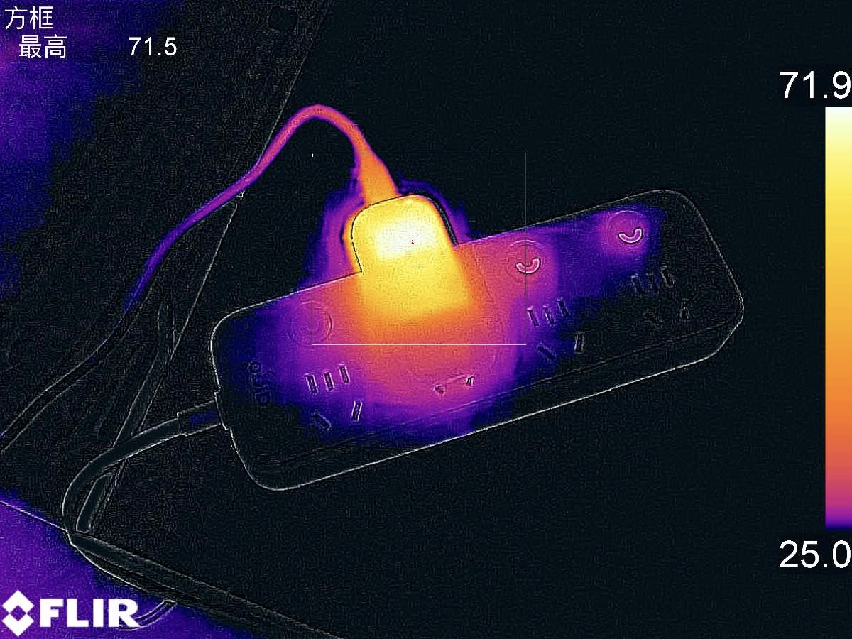 作为参照,满载一小时测试中,低功率密度的氮化镓充电器满载温度一般在60-70度之间,而高功率密度的单口氮化镓充电器一般在70度左右,高功率密度的多口氮化镓充电器温度一般都会超过70度。