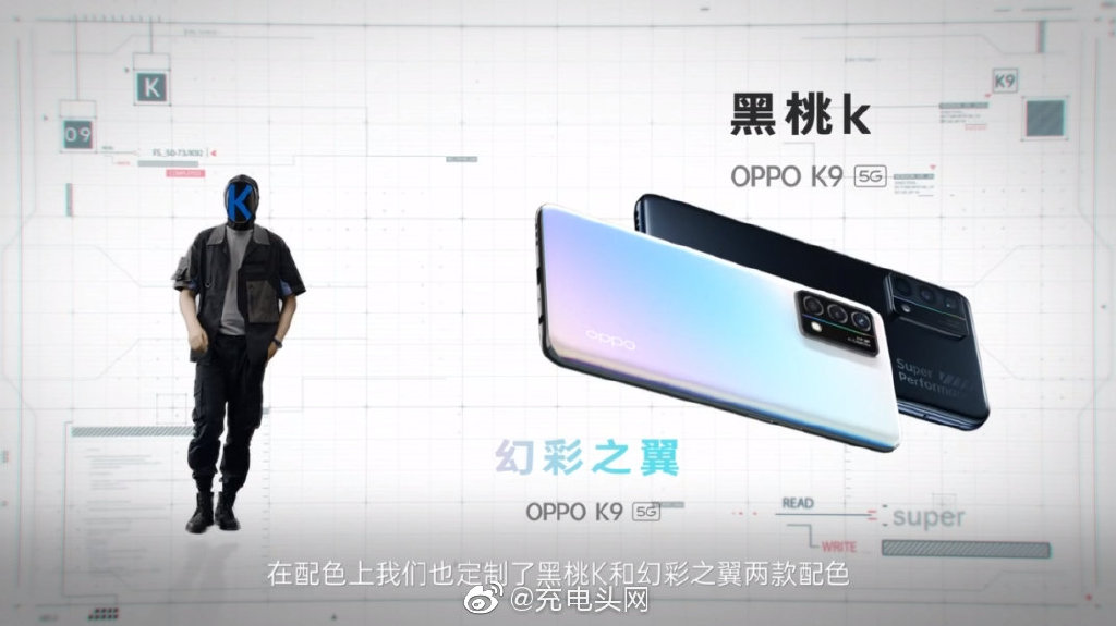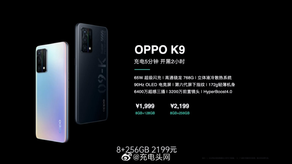 OPPO K系列手机定位于入门性价比机型,此次K9采用高通骁龙768G处理器,2.8GHz超高主频大核的超频5G游戏芯,6.43英寸钻石排列的90Hz OLED电竞屏,第六代屏下指纹解锁,172g轻薄机身,6400万像素超感三摄系统,只有172g重量的轻薄机身,黑桃K与幻彩之翼两种配色可选。
