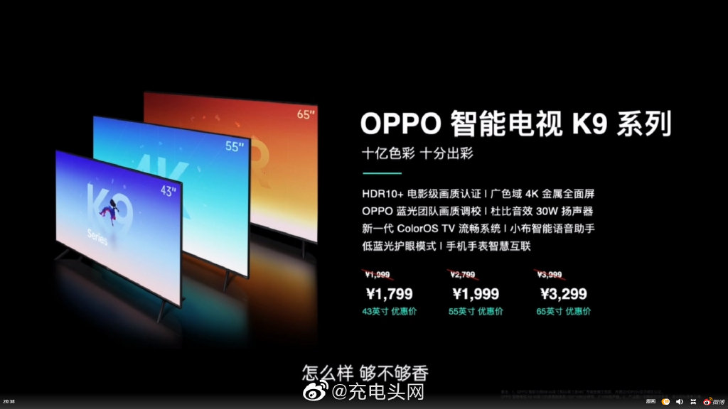 OPPO智能电视K9系列,支持HDR10+电影级画质认证,广色域4K金属全面屏,杜比音效30W扬声器。43英寸定价1999元、55英寸2799元、65英寸3999元,首销其间优惠后43英寸到手价1799元、55英寸首销到手价1999元、65英寸首销到手价3299元。