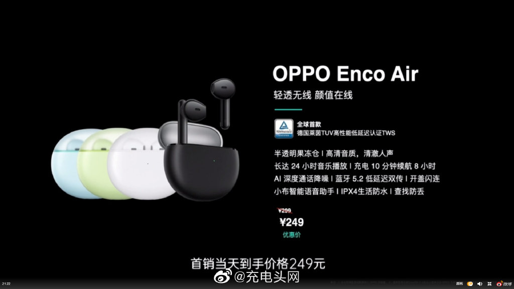 OPPO Enco Air 无线耳机,采用半透明果冻仓设计,长达24小时音乐播放,充电10分钟即可续航8小时,采用低延迟双传的蓝牙5.2标准,支持开盖闪连、IPX4生活防水、查找防丢等功能,并是全球首款获得德国莱茵高性能低延迟认证的TWS无线耳机。价格方面,OPPO Enco Air 无线耳机定价为299元,首销到手价为249元,5月11日正式开售。