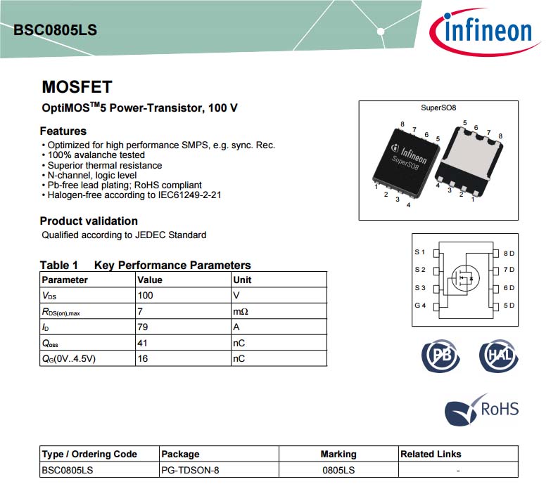 同步整流管采用英飞凌BSC0805LS,耐压100V,导阻7mΩ,SuperSO8封装。