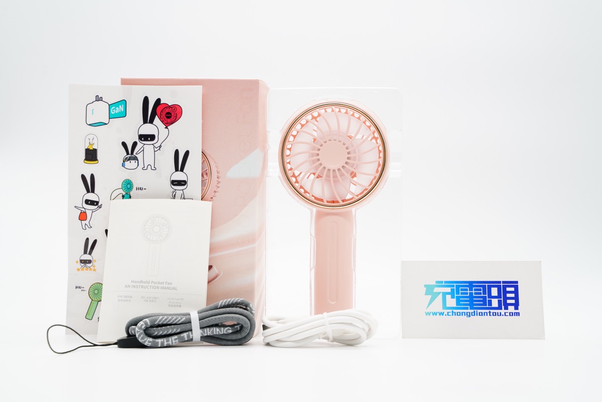 直接拆开包装盒,除了风扇主体外还附赠了充电线和挂绳,说明书以及个性贴纸。