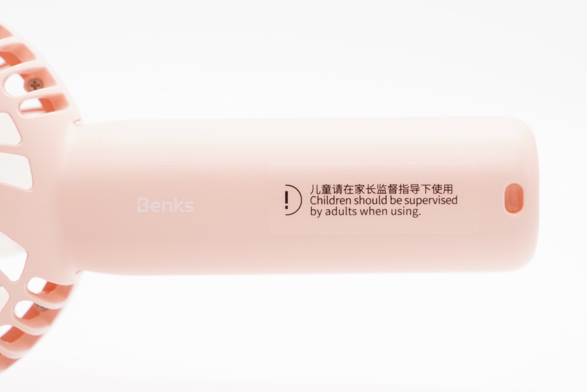扇柄上除了印有“Benks”的品牌Logo外还有注意事项标注:儿童请在家长监督下使用。