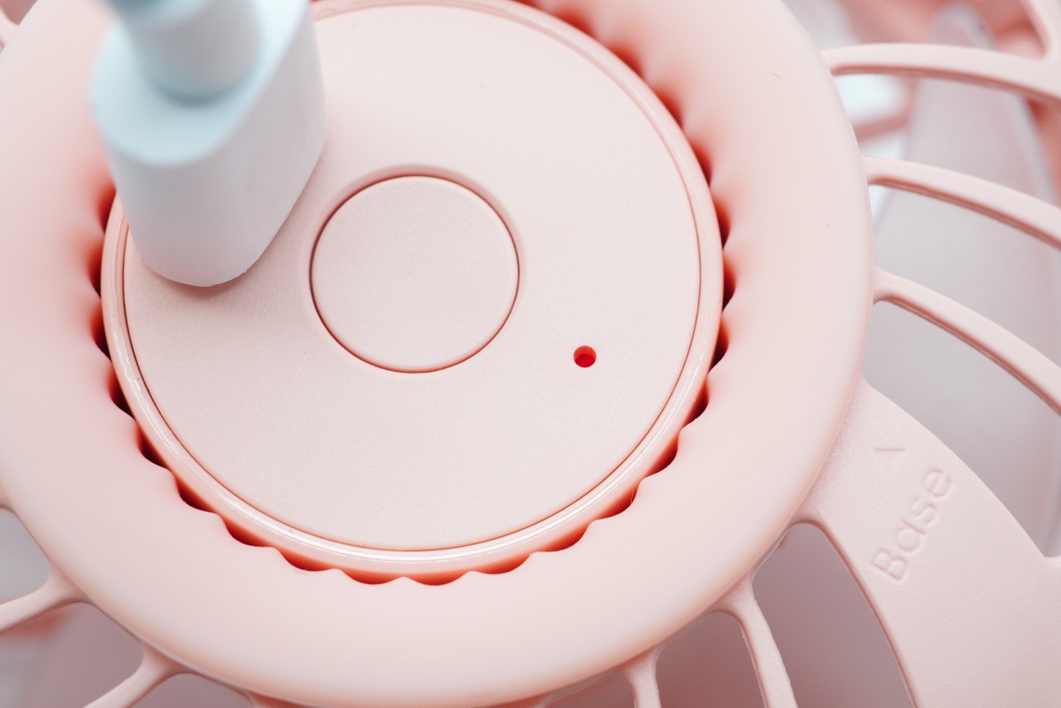 此外风扇自带胶质底座,底座采用隐藏式的设计,隐藏在电源按键的四周。小设计很不错,不使用时可以随着风扇携带,使用时随手取出即可。
