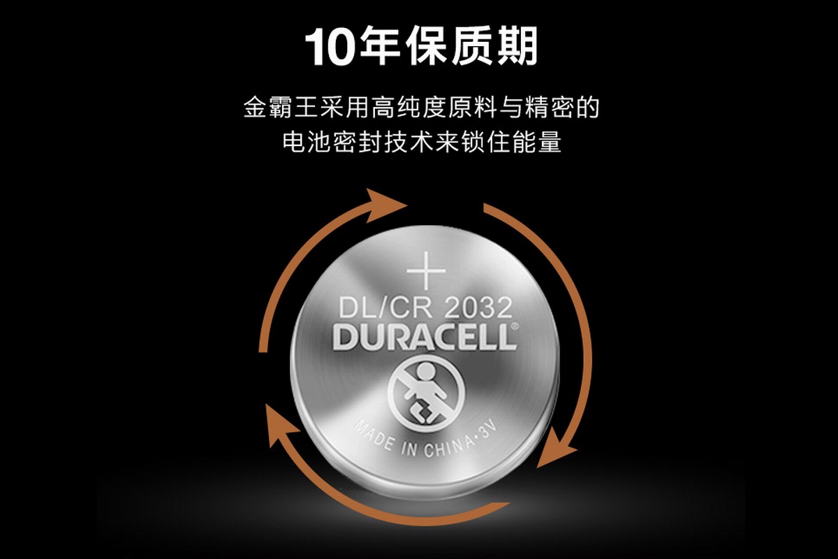 金霸王CR2032采用高纯度原料与精密的电池密封技术,低自放电存储一年后电量仍达98%,可提供10年质保期,采用无汞环保配方,零下20度至零上60度都可以使用,并采用儿童不易接触的包装工艺,确保家居存放安全。