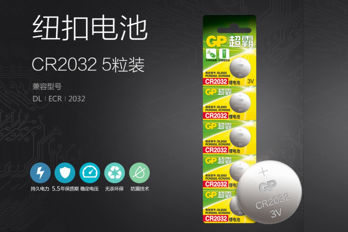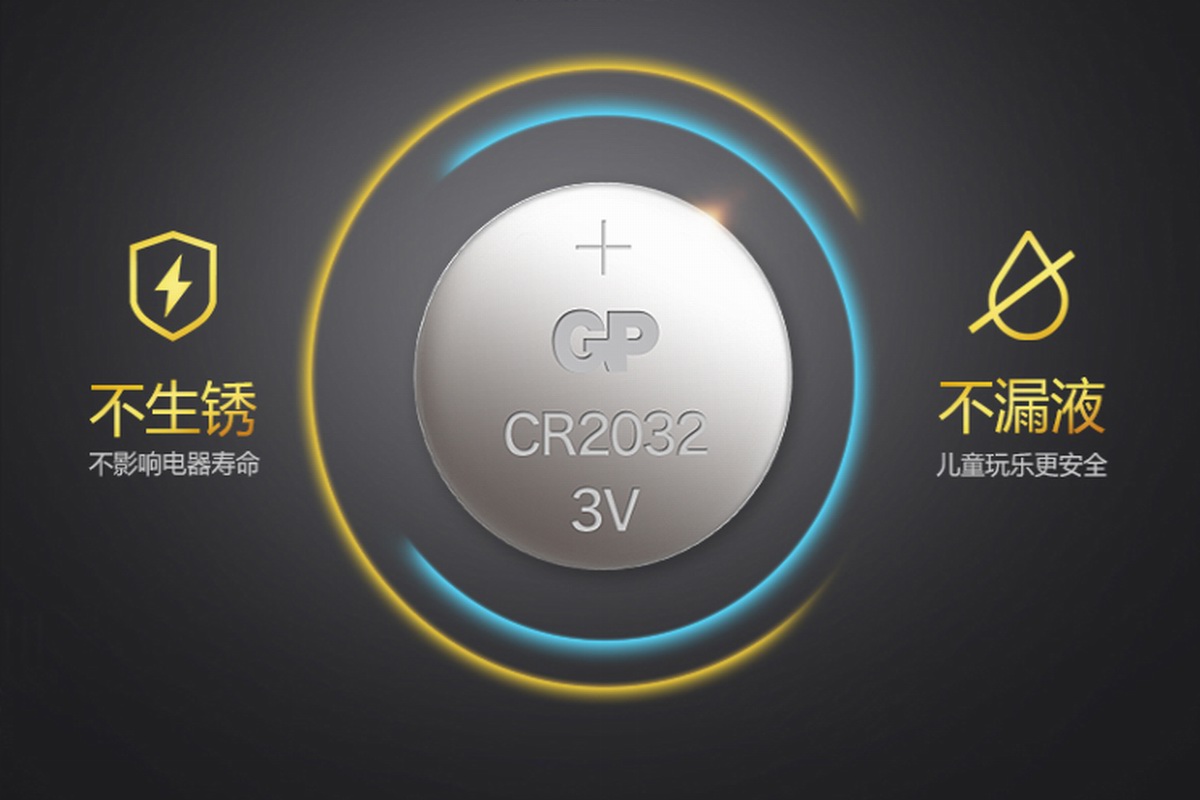 GP超霸CR2032采用不锈钢材质制作壳体,高密封性安全不漏液,采用无汞无铬环保配方制作,电压平台3V,保存期限5.5年。