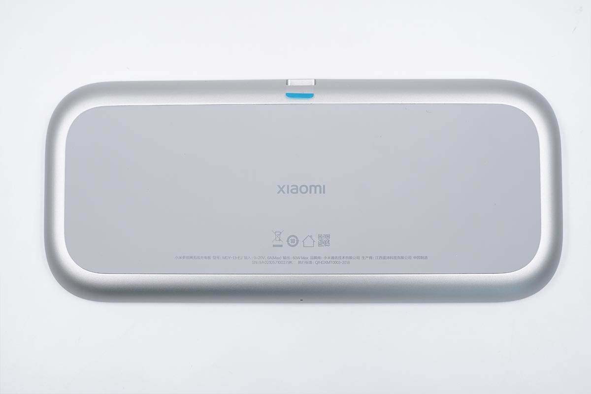小米多线圈无线充电板顶部是硅胶材质,搭配铝合金底壳与PC塑胶框架制作,整体风格简约。
