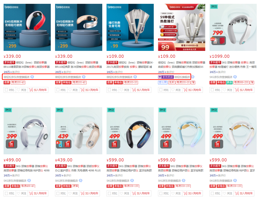 两大主要线上平台的搜索之后,我发现似乎肩颈按摩仪的品牌虽然多,但是似乎只有SKG和倍轻松是“顶流”?