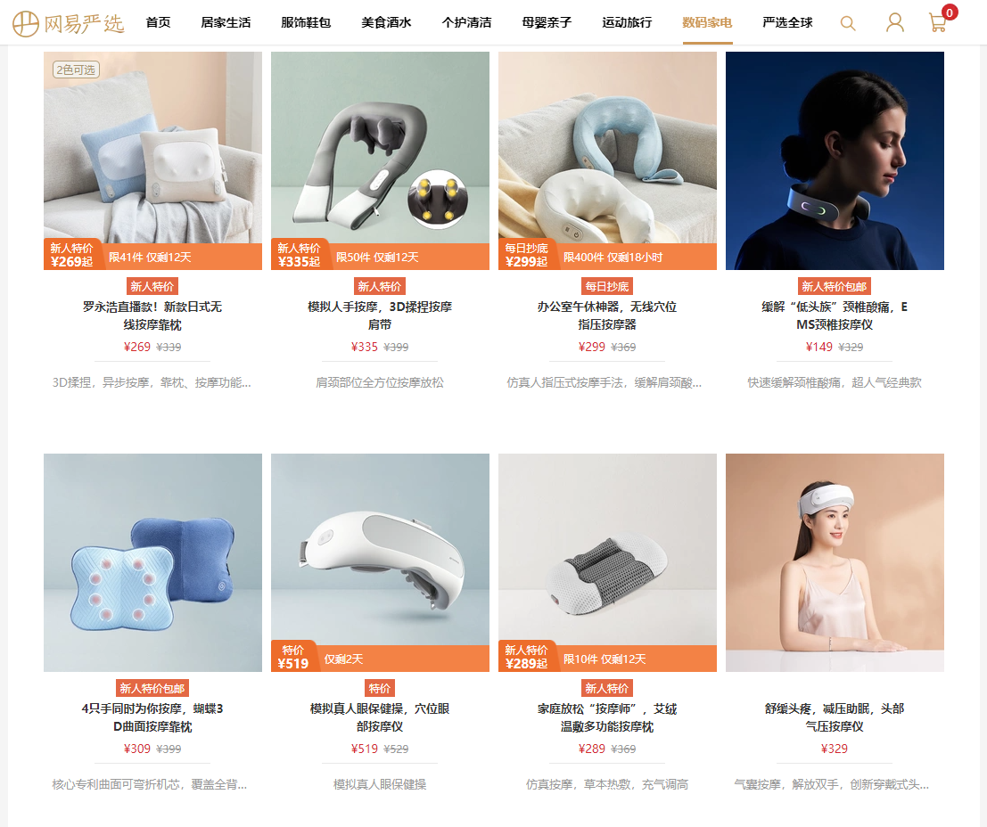 再看看网易严选,按摩类产品不少,其中肩颈按摩仪类占比不低,有十几款的样子,价位都在100到300元之间。