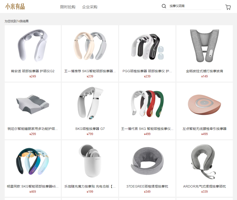 先是小米有品,SKG也入驻其中,除此之外也有几十款产品,但定位都没有超过SKG。