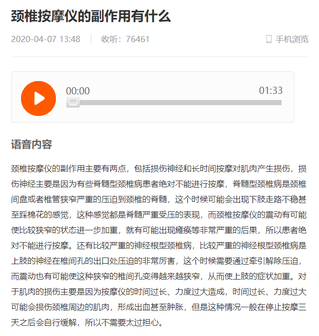 笔者在网上一些问医平台找到相关的颈部按摩仪问答,作用、效果以及副作用都非常详尽、专业,大家可以引为参考。