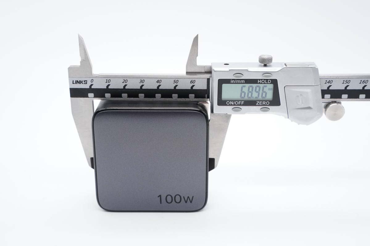 使用游标卡尺实测充电器机身长度为68.96mm。