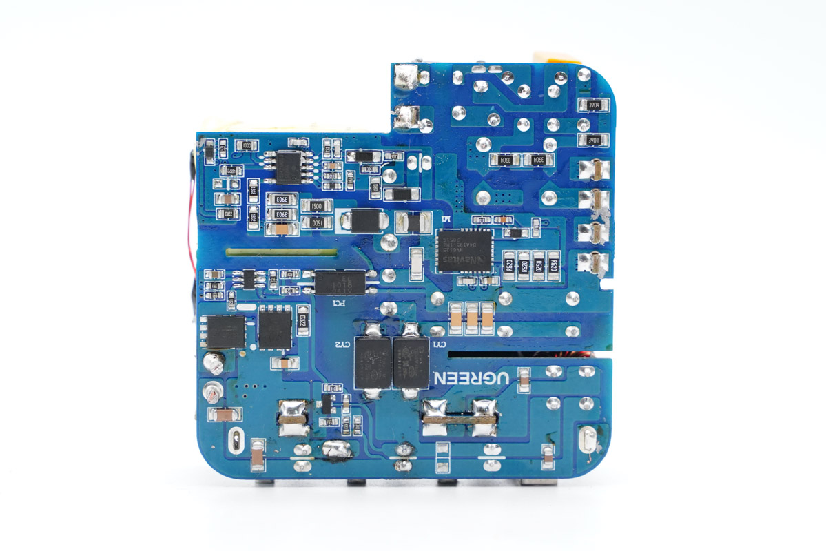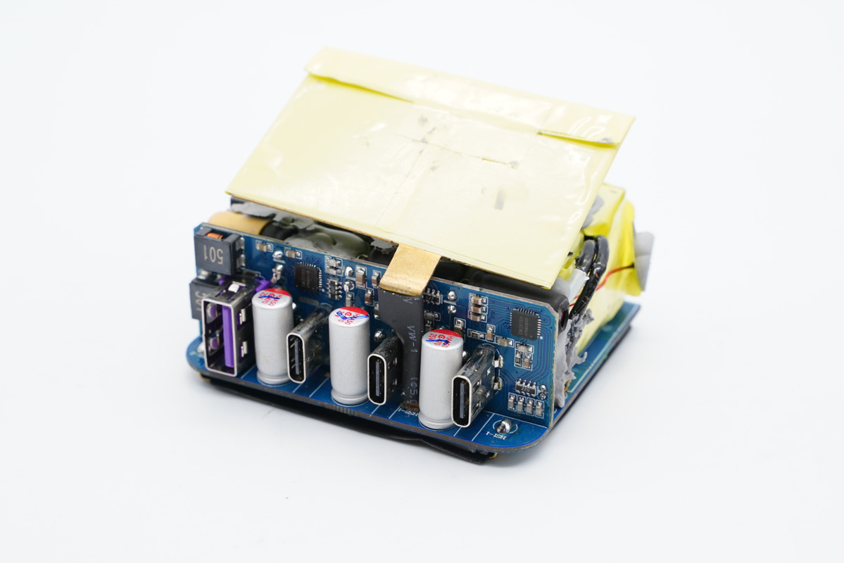 充电头网通过拆解了解到,充电器输入端设有一块小板,三路降压电路以及四个USB接口母座均在这块小板上。充电器开关电源由安森美NCP1342主控搭配纳微NV6125氮化镓功率芯片。三路输出均采用智融SW3516H方案,同时采用钰邦固态电容进行二次滤波,品质有保证。