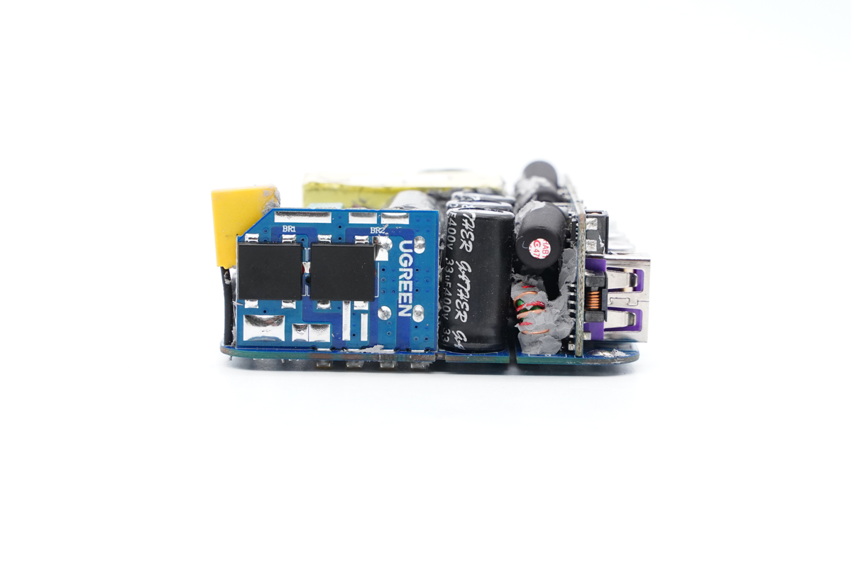 通过对充电器观察发现,绿联这款100W 3C1A氮化镓充电器采用开关电源定压输出,三路二次降压四口输出架构,其中C1、C2口单独一路宽范围输出,C3口和A口一路,输出功率智能分配。下面我们从输入端开始深入了解整个电路设计情况。