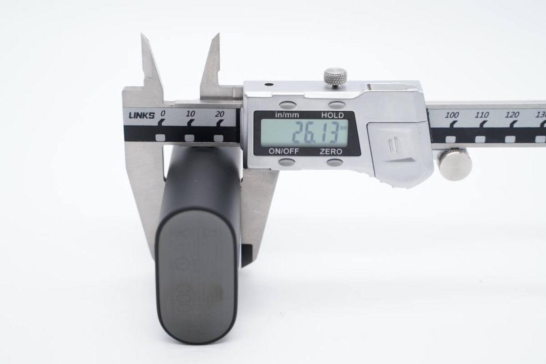 通过对比可以大概看出,这款移动电源的厚度相当于一元硬币的直径,宽度相当于一元直径的两倍。