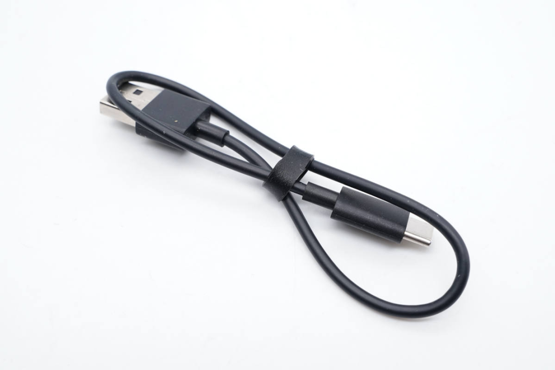 移动电源使用防尘袋包裹,附赠一条USB-A to USB-C充电短线。