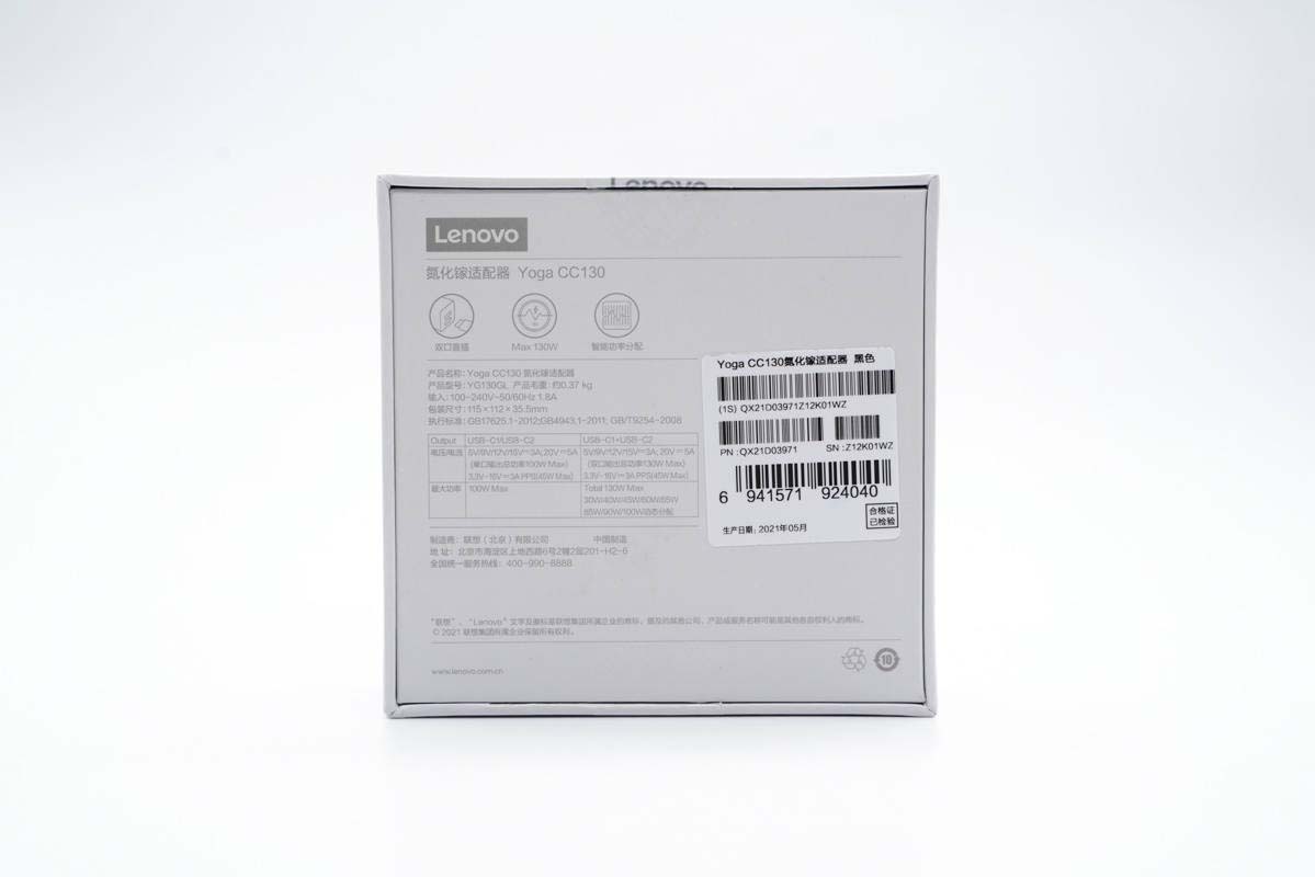 联想YOGA这款130W双C口氮化镓充电器延续光滑圆润外壳加切面输入端ID设计,使用不硌手,而且充电器也能稳定贴合在墙面插座上,充分考虑了用户的使用体验。另外产品包装盒也是一如既往给人一种高大上的感觉。配备的双C口,支持PD和PPS快充协议,实测具备5A PPS电压档位,单C口输出最大100W,总输出可达130W,充分满足各类设备对不同功率的需求。