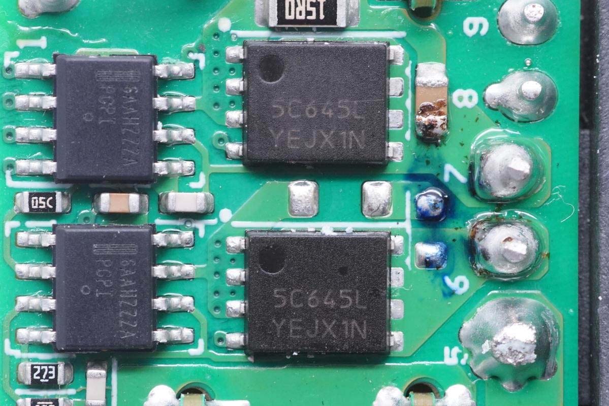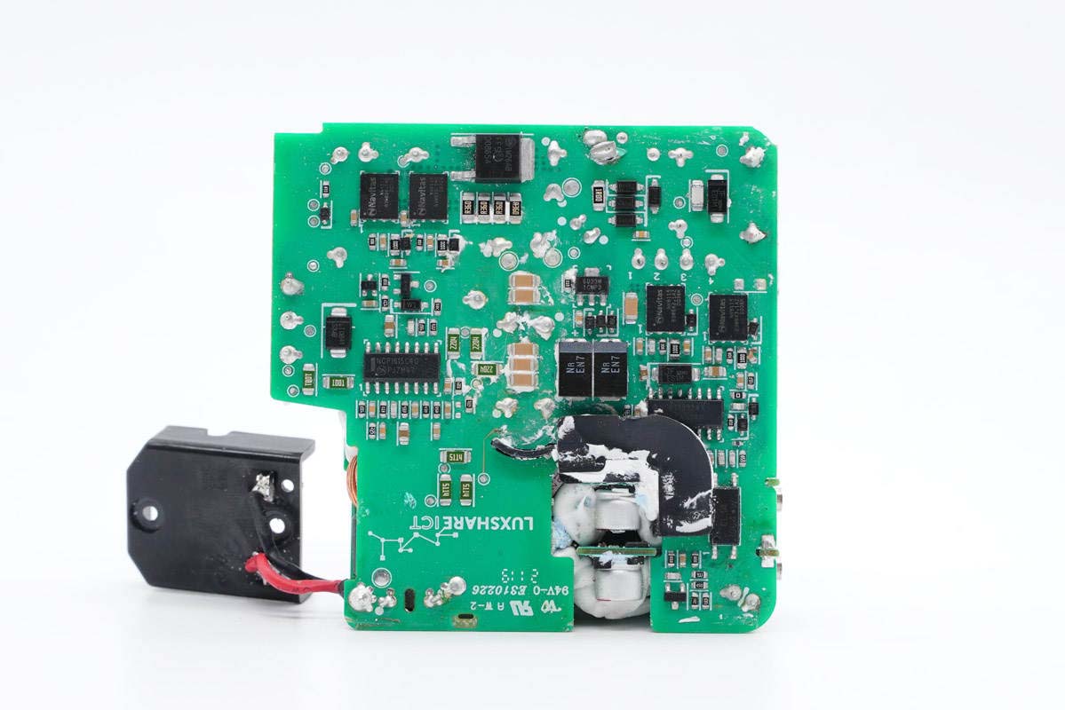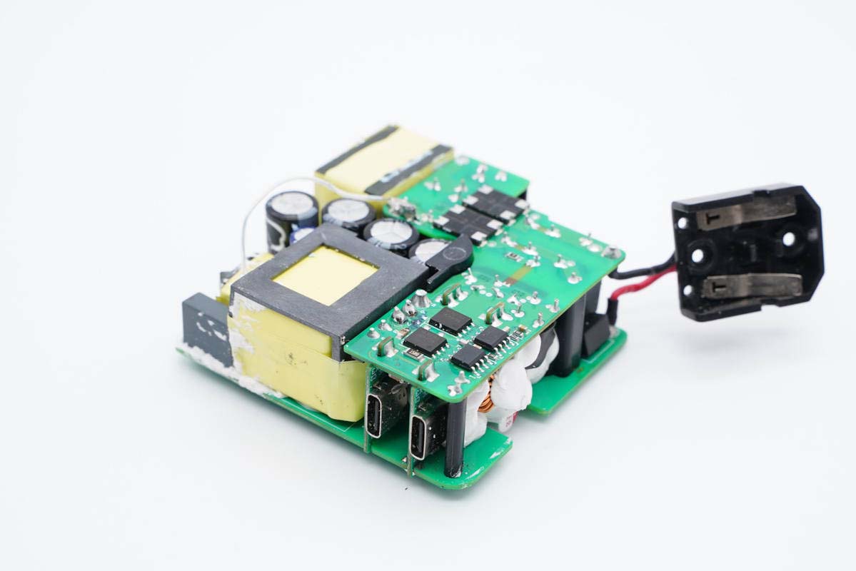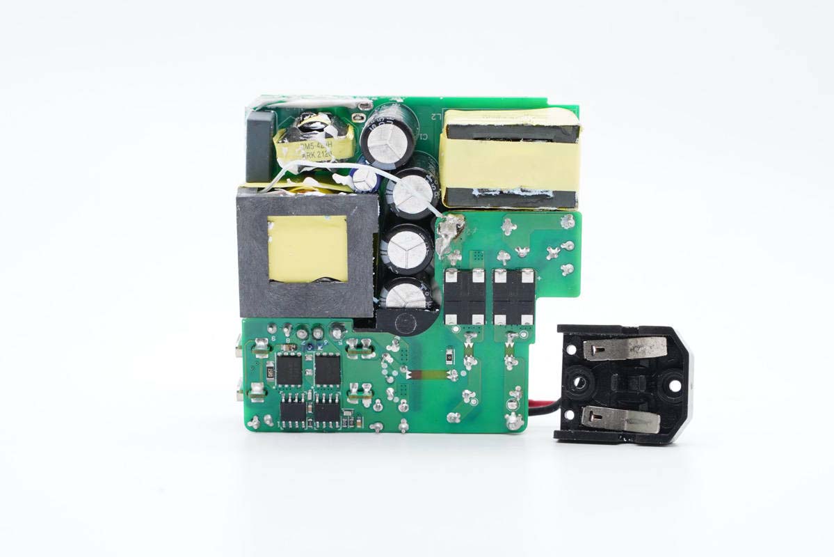 主板背面可以看到四颗纳微的开关管,左上角两颗用于PFC升压开关管,顶部是PFC整流管,右侧两颗是LLC开关管。PCB上印有“LUXSHARE ICT”字样,由立讯精密代工。