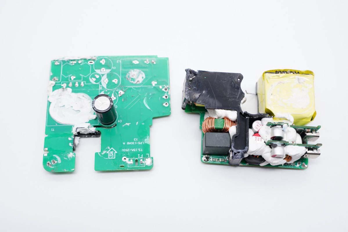 将两块板子拆分开,主板上的电容、PFC升压电感等已被拆掉,另一颗Z型小板上,元器件打胶加固。