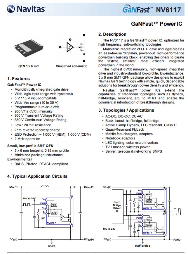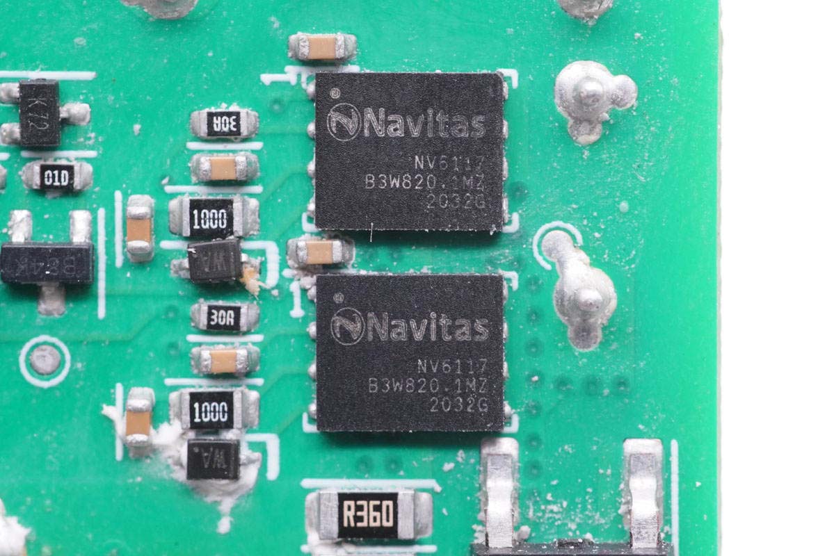 PFC开关管采用两颗纳微NV6117并联,NV6117内部集成氮化镓开关管,驱动器以及逻辑控制电路,耐压650V,Rds_ON为120mΩ,支持800V瞬态耐压,采用QFN5*6封装。