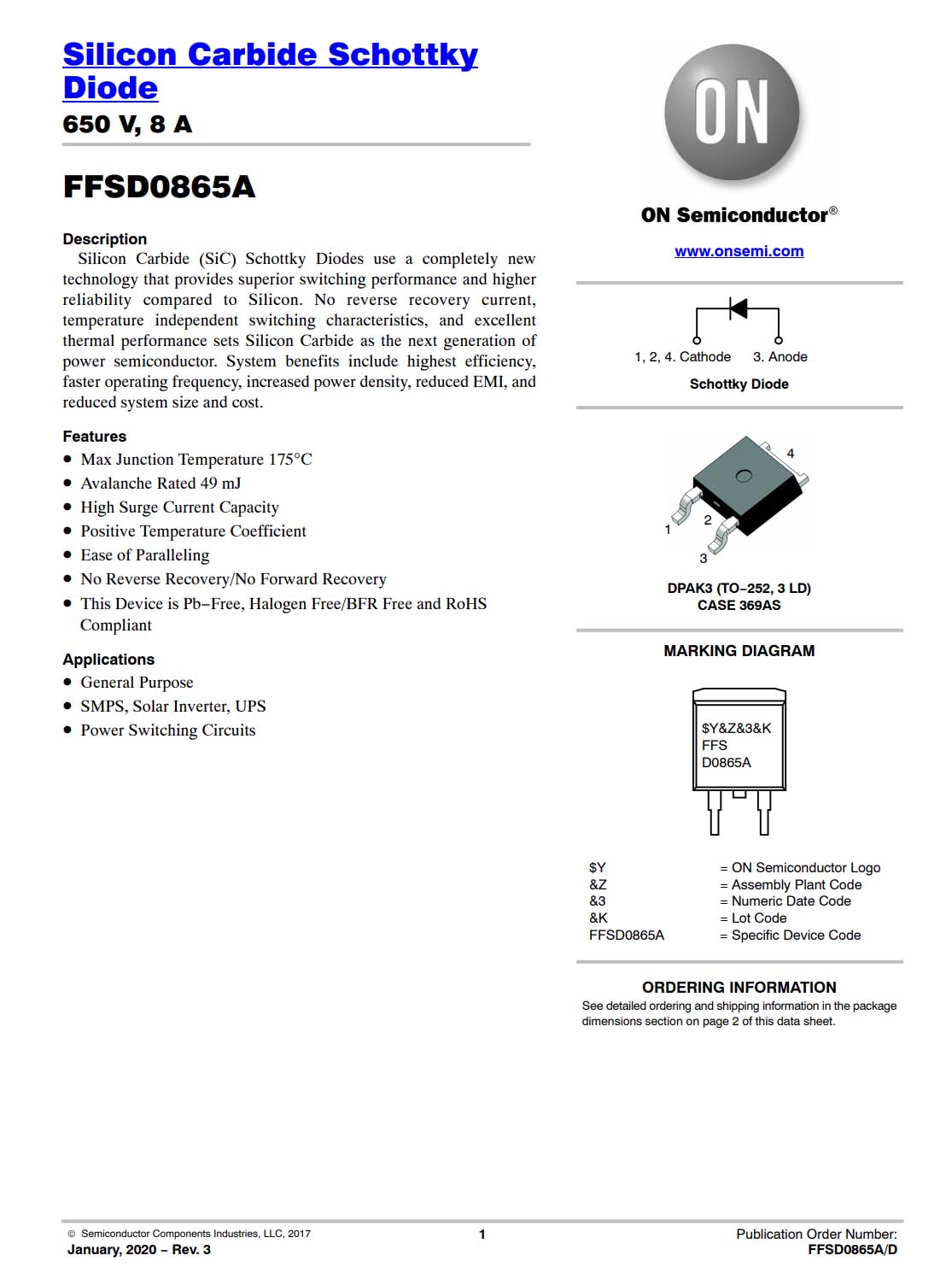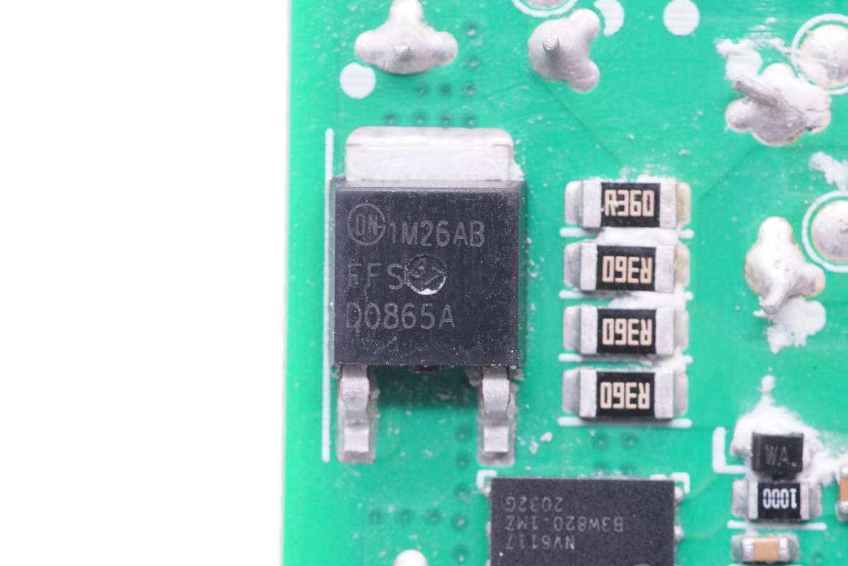 PFC整流管采用安森美 FFSD0865A,8A碳化硅二极管,最高结温175℃,耐压650V,8A电流,右侧四颗0.36Ω电阻并联用于电流检测。