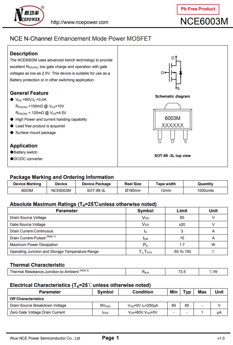 为主控芯片供电的MOS管,采用无锡新功率,NCE6003M,耐压60V,用于稳压为主控芯片供电。