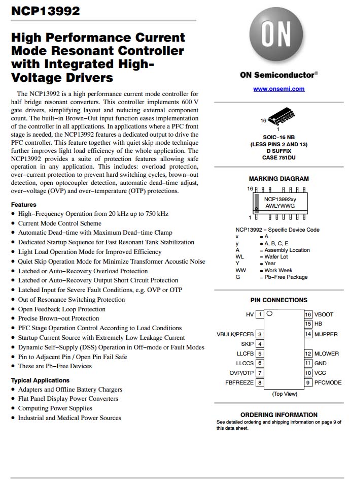 开关电源主控芯片采用安森美NCP13992,高性能电流模式谐振LLC控制器,内部集成高压驱动器,支持最高750KHz工作频率。
