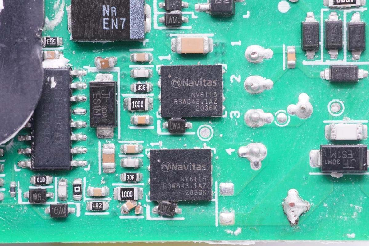 两颗纳微NV6115组成LLC半桥,该芯片内置驱动器以及复杂的逻辑控制电路,170mΩ导通电阻,耐压650V,支持2MHz开关频率,采用5*6mm QFN封装,节省面积,得益于NV6115内置驱动器,无需外置驱动器,更加节省PCB空间。