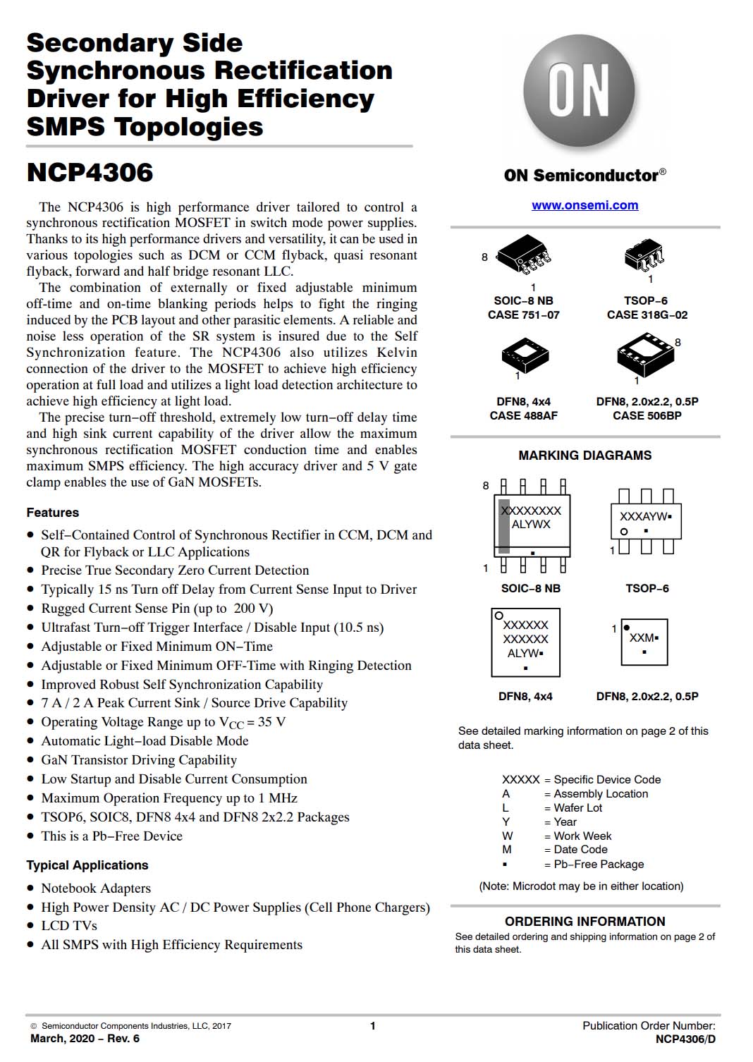 同步整流控制器是安森美NCP4306,驱动安森美同步整流管进行同步整流。支持最高1MHz开关频率。NCP4306支持DCM/CCM/QR反激,还支持LLC半桥同步整流。,使用两颗用于LLC同步整流