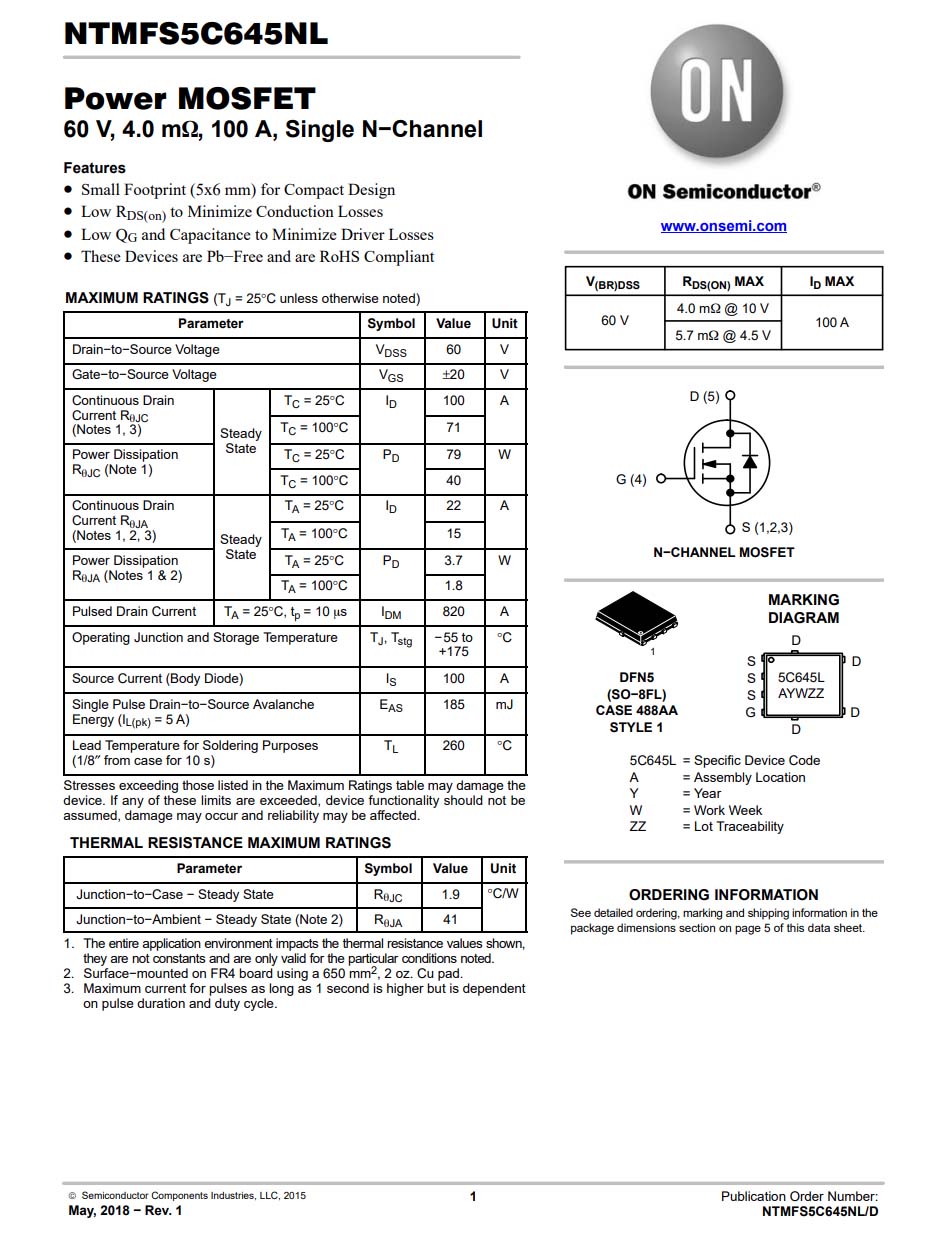 两颗安森美NTMFS5C645NL NMOS管用于同步整流,耐压60V,导阻4mΩ,采用DFN5*6封装。