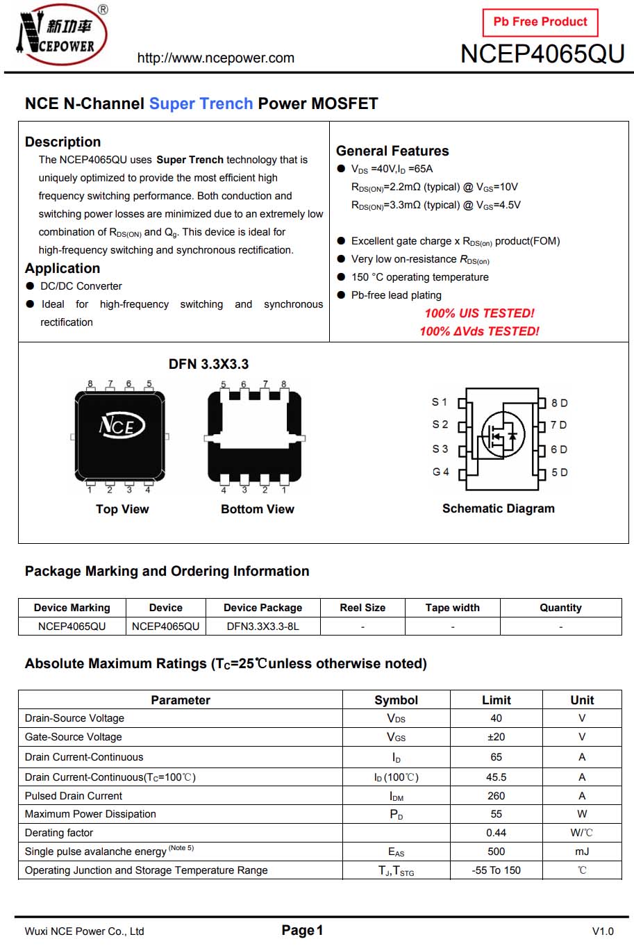 无锡新功率 NCEP4065QU,PMOS,耐压40V。