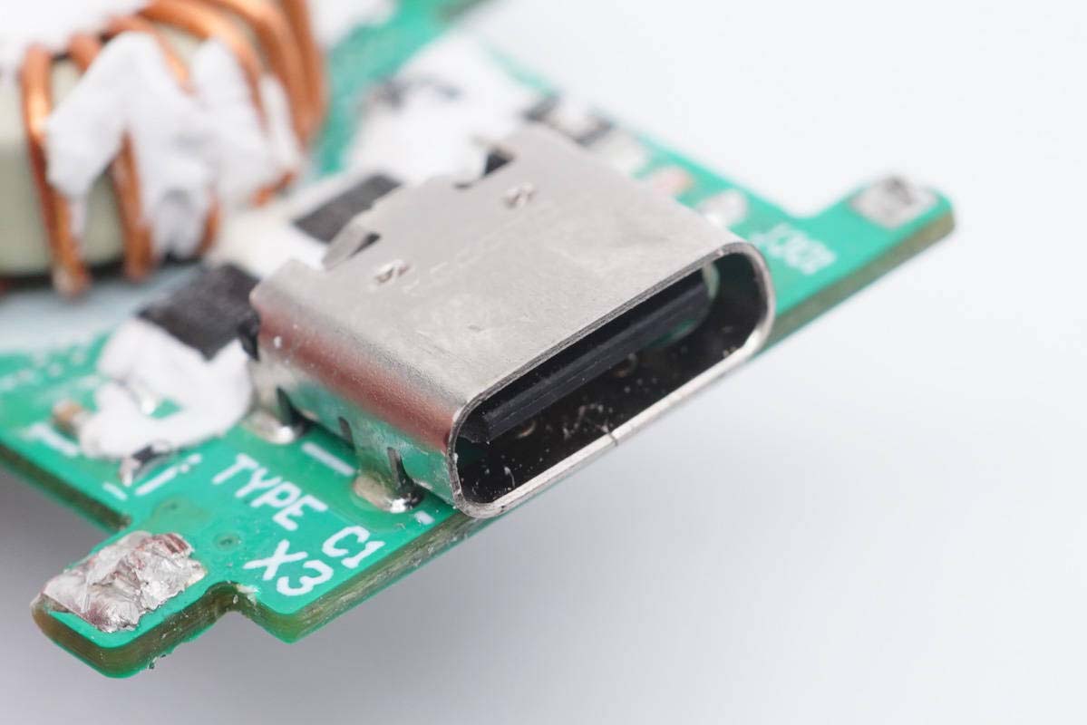 USB-C母座特写,黑色胶芯,过孔焊接。