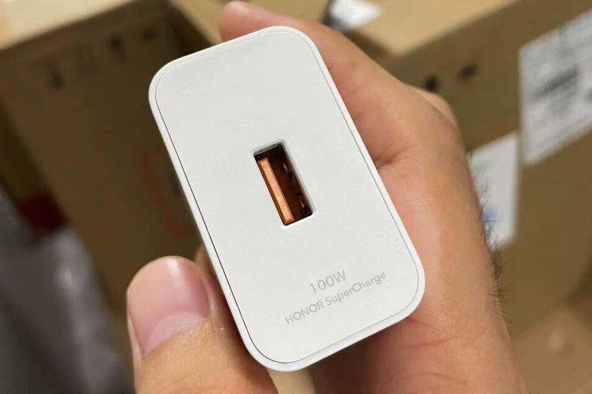 荣耀100W超级快充充电器与此前荣耀快充系统都采用私有A口快充系统,橘色大电流母座,充电器输出接口上印刷着“100W”、“HONOR SuperCharge”字眼,款式设计与华为、荣耀66W保持一致风格。(图源:数码闲聊站)