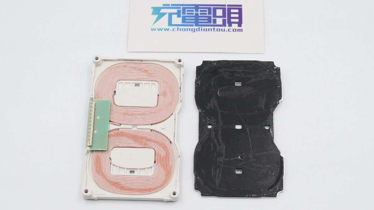 铝板拆下,塑料衬板内叠加放置三个无线充电线圈。