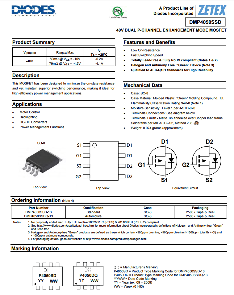 达尔DMP4050SSD,双PMOS,耐压40V。